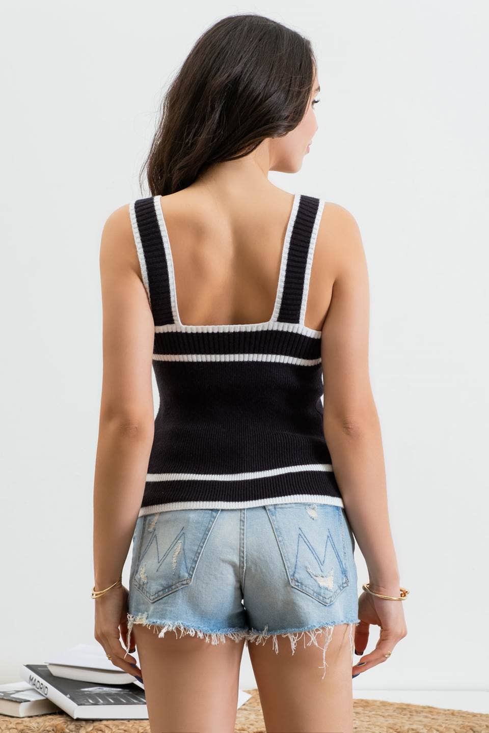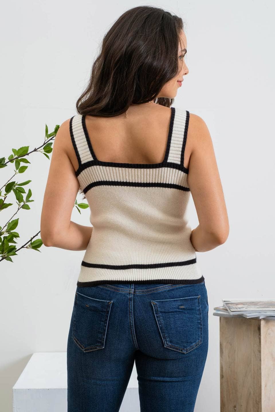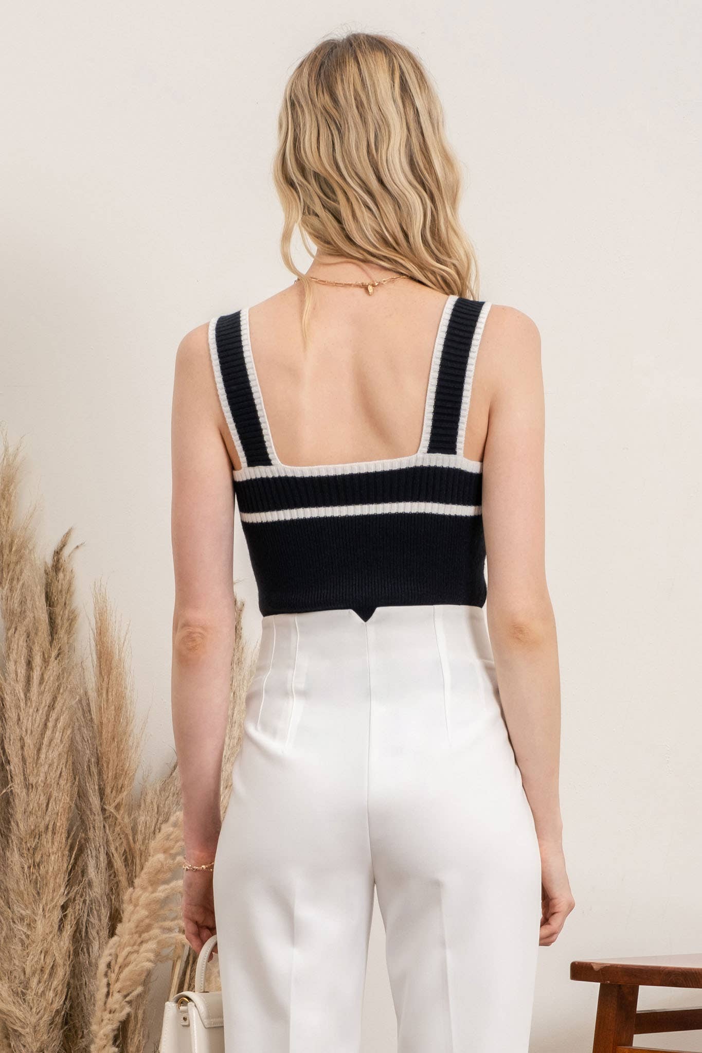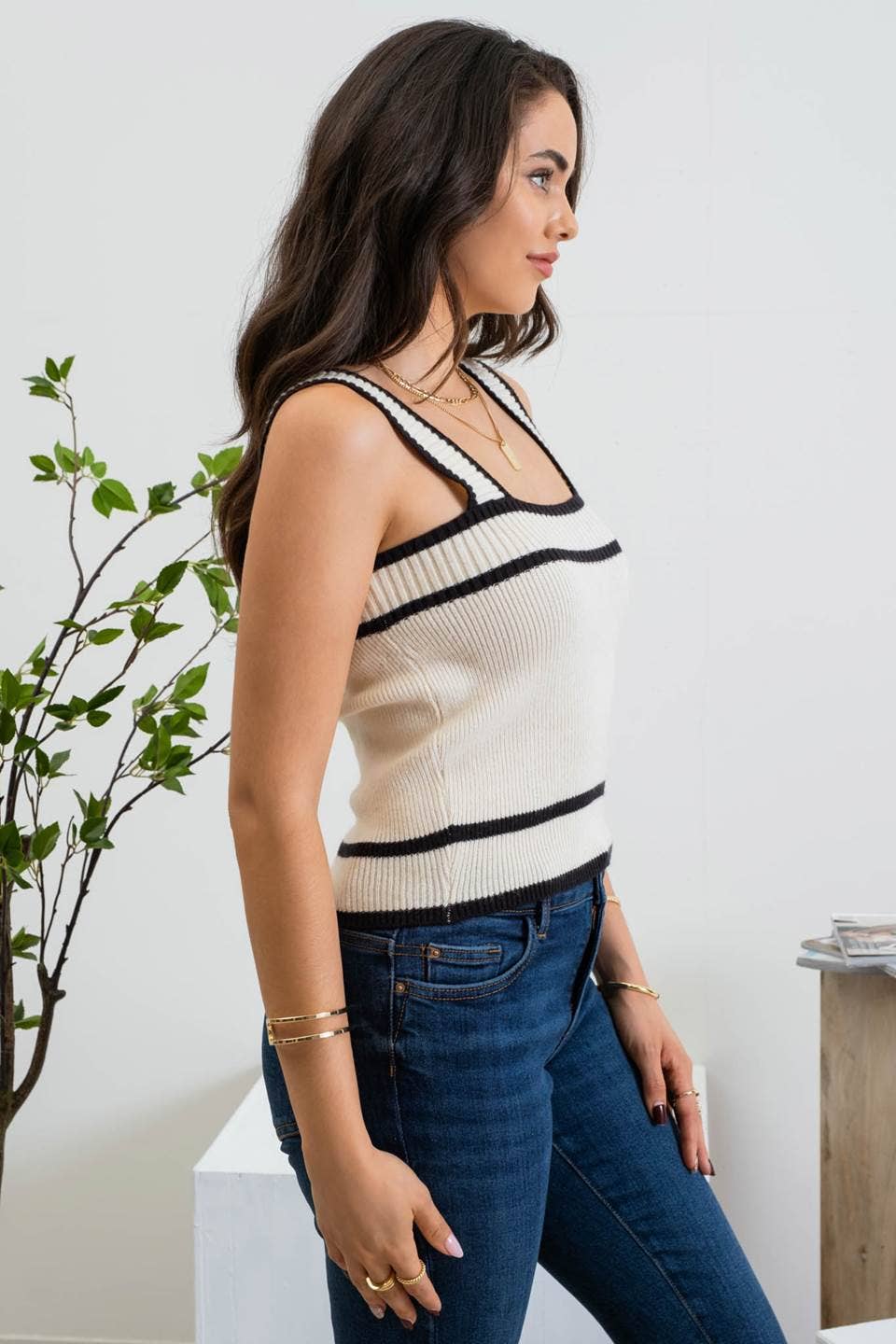 This sleeveless sweater top features a stylish striped design, making it suitable for both casual and dressy occasions. The top's knit fabric provides comfort and breathability while adding a fashionable touch to any outfit.