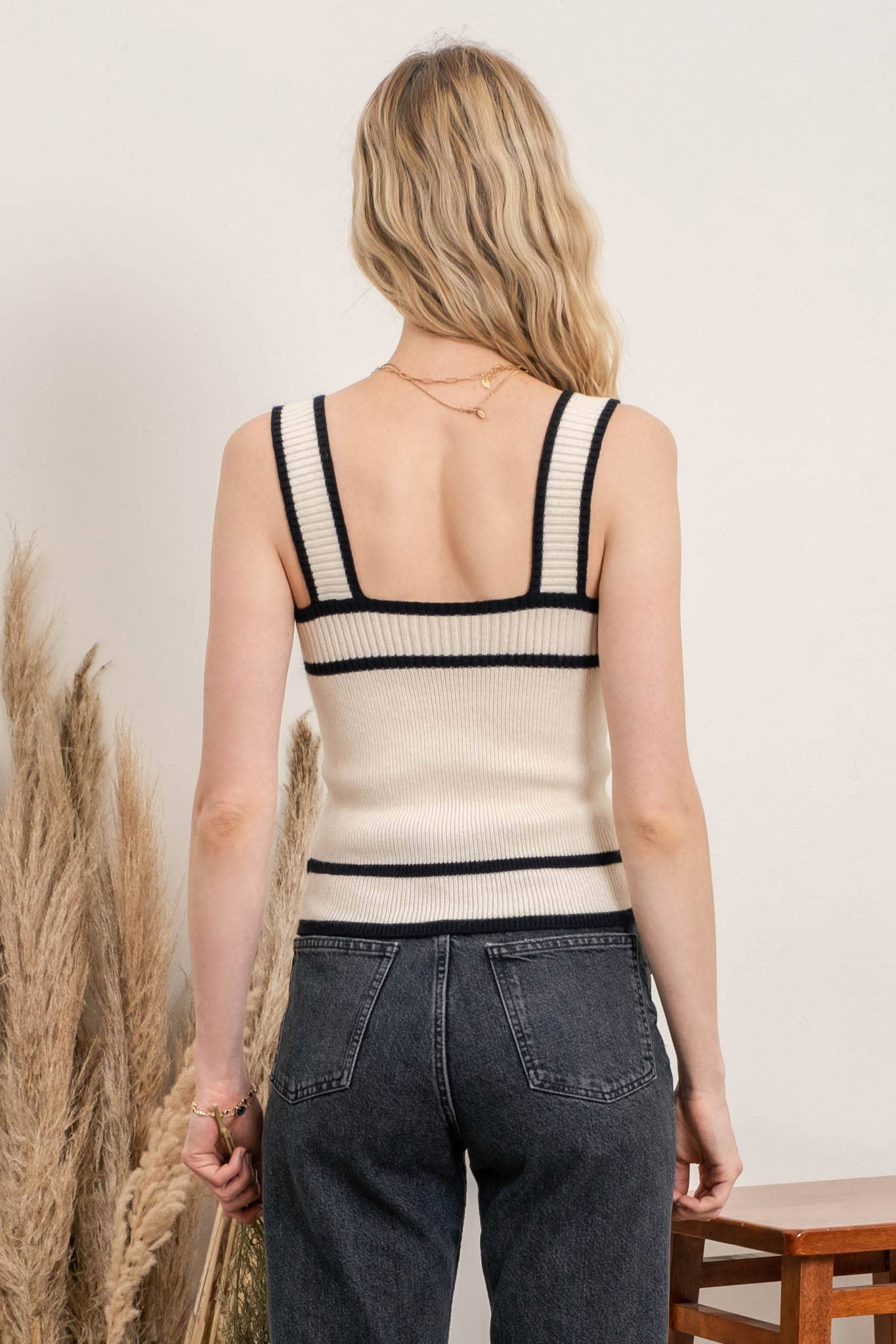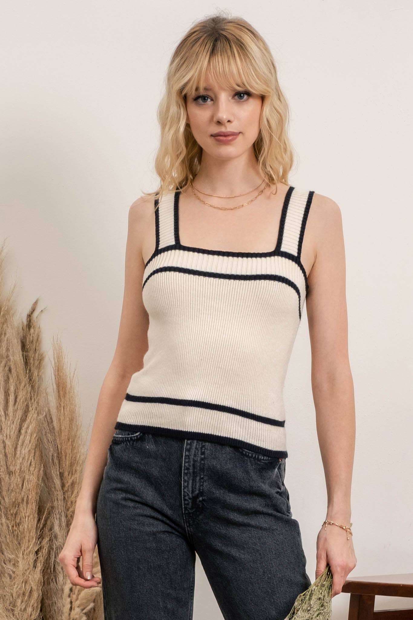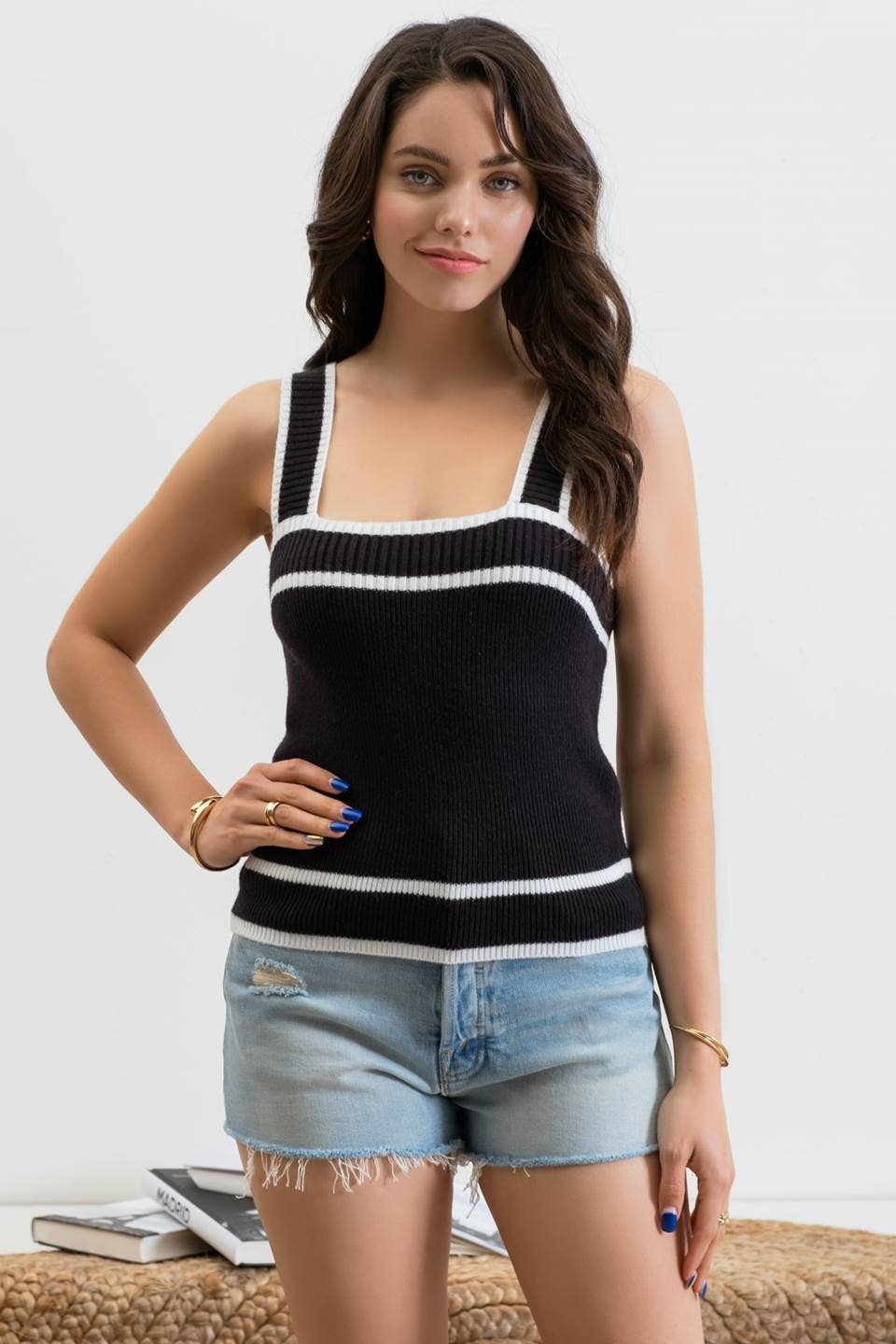 This sleeveless sweater top features a stylish striped design, making it suitable for both casual and dressy occasions. The top's knit fabric provides comfort and breathability while adding a fashionable touch to any outfit.