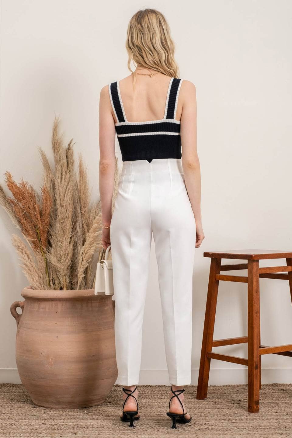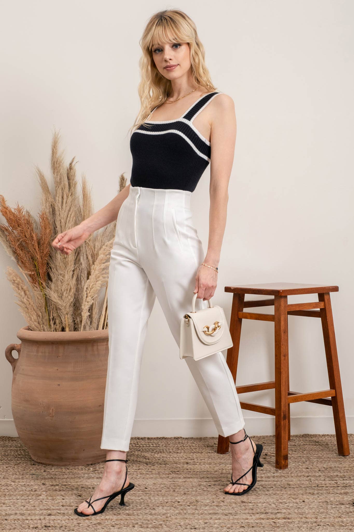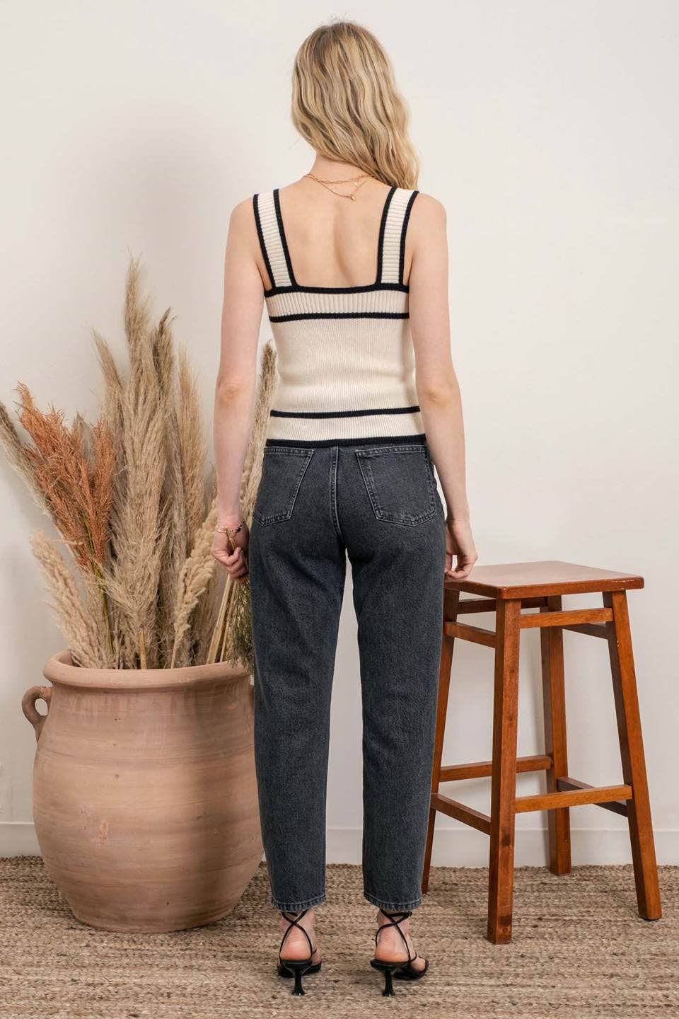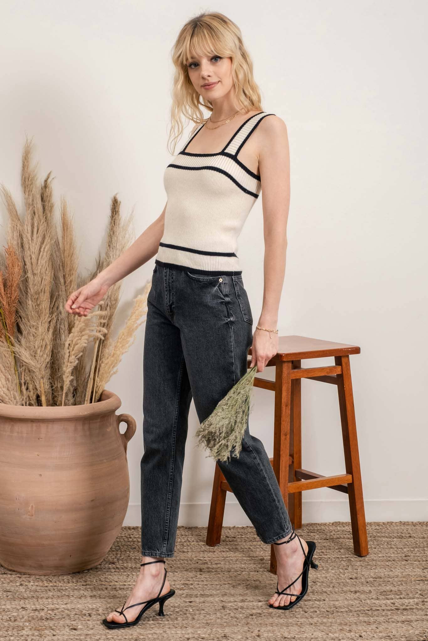This sleeveless sweater top features a stylish striped design, making it suitable for both casual and dressy occasions. The top's knit fabric provides comfort and breathability while adding a fashionable touch to any outfit.