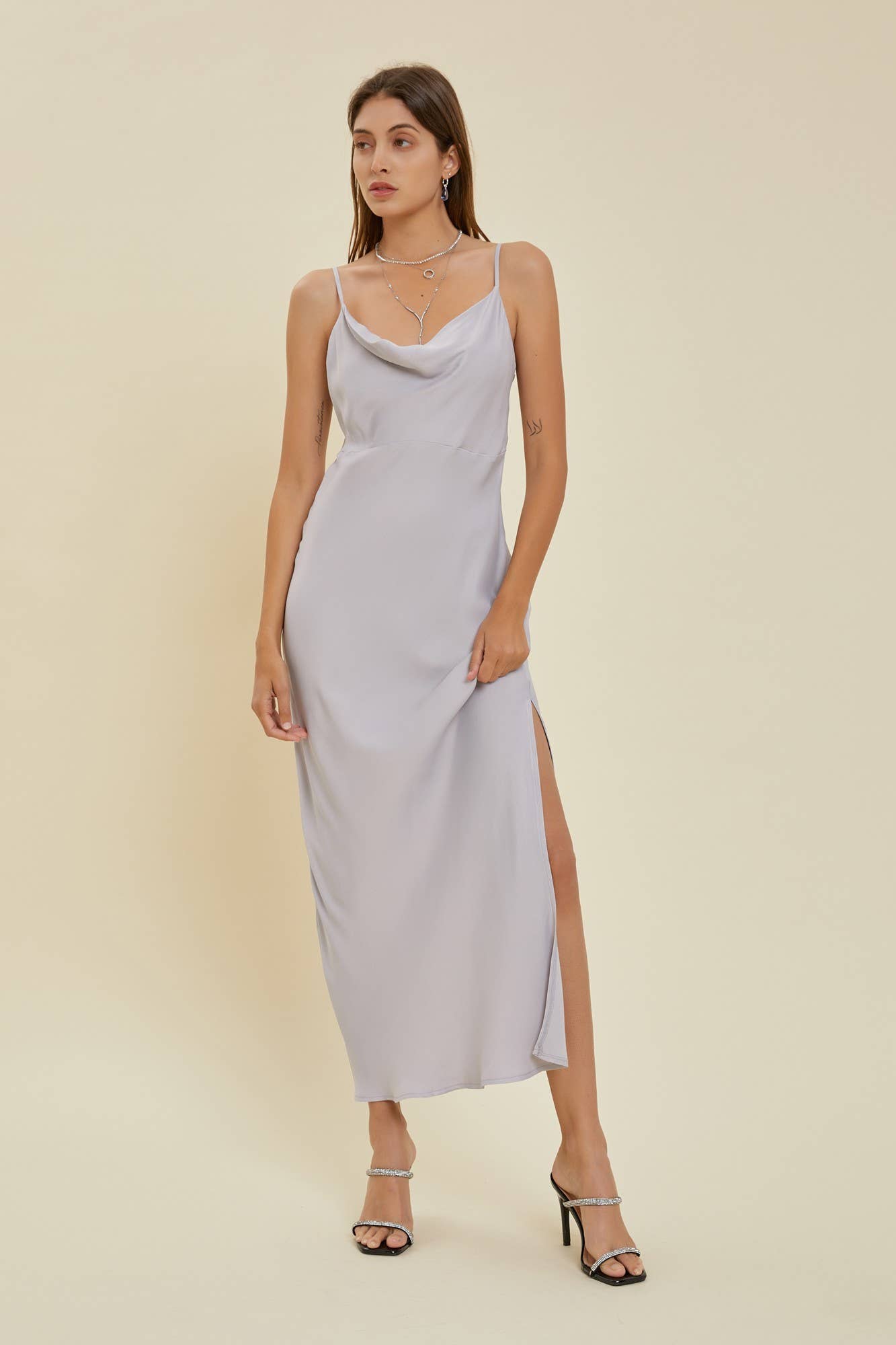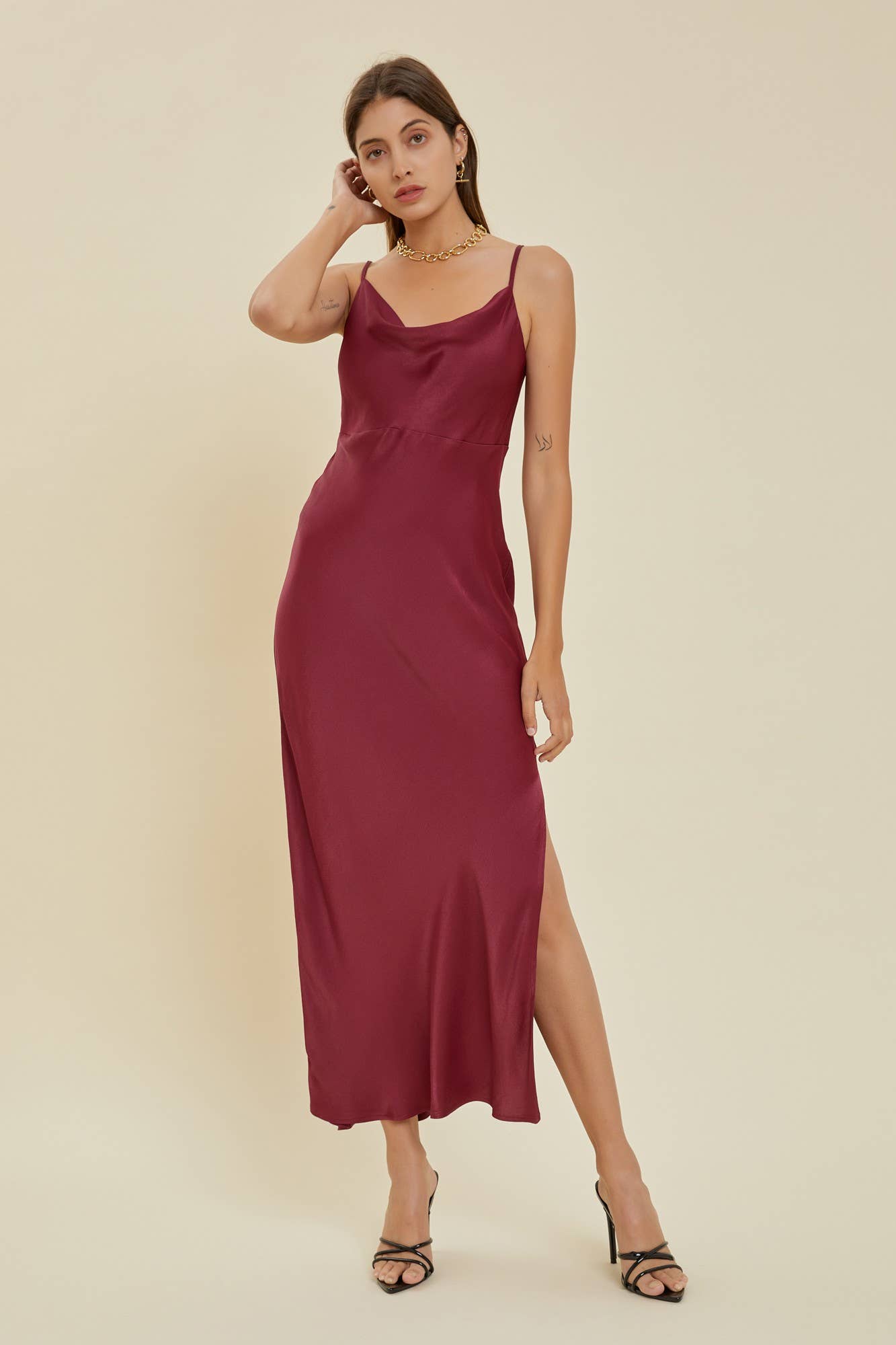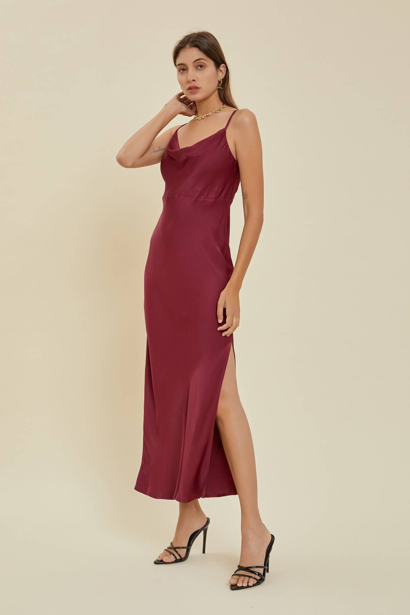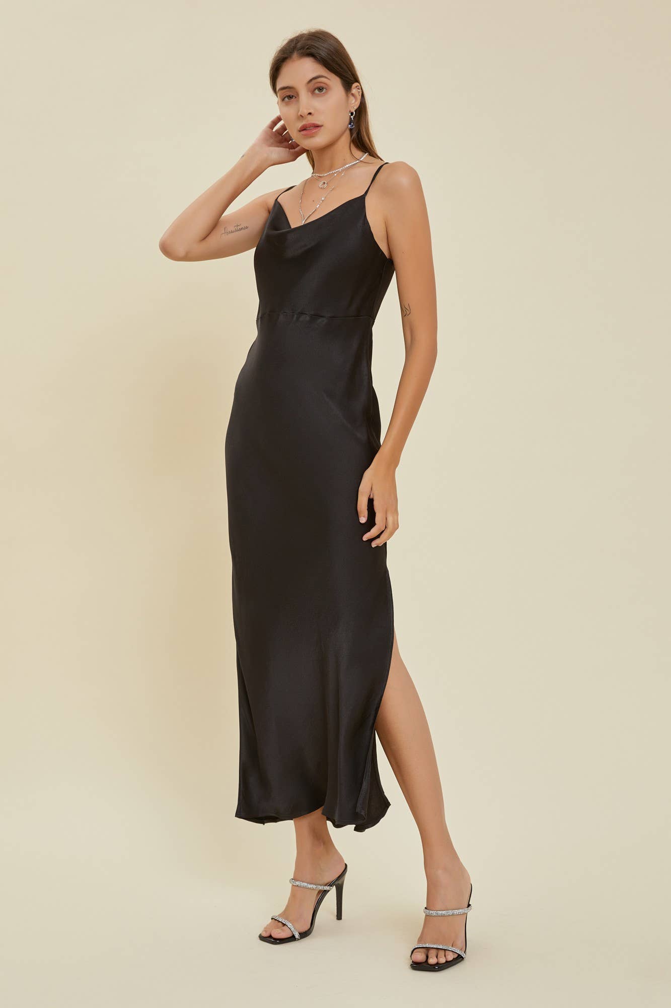 Introducing our elegant Cowl Neck Slip Dress. Made with a flattering cowl neckline and adjustable straps, it effortlessly enhances your silhouette. The side slit adds a touch of sophistication. Expertly crafted for a stunning look.