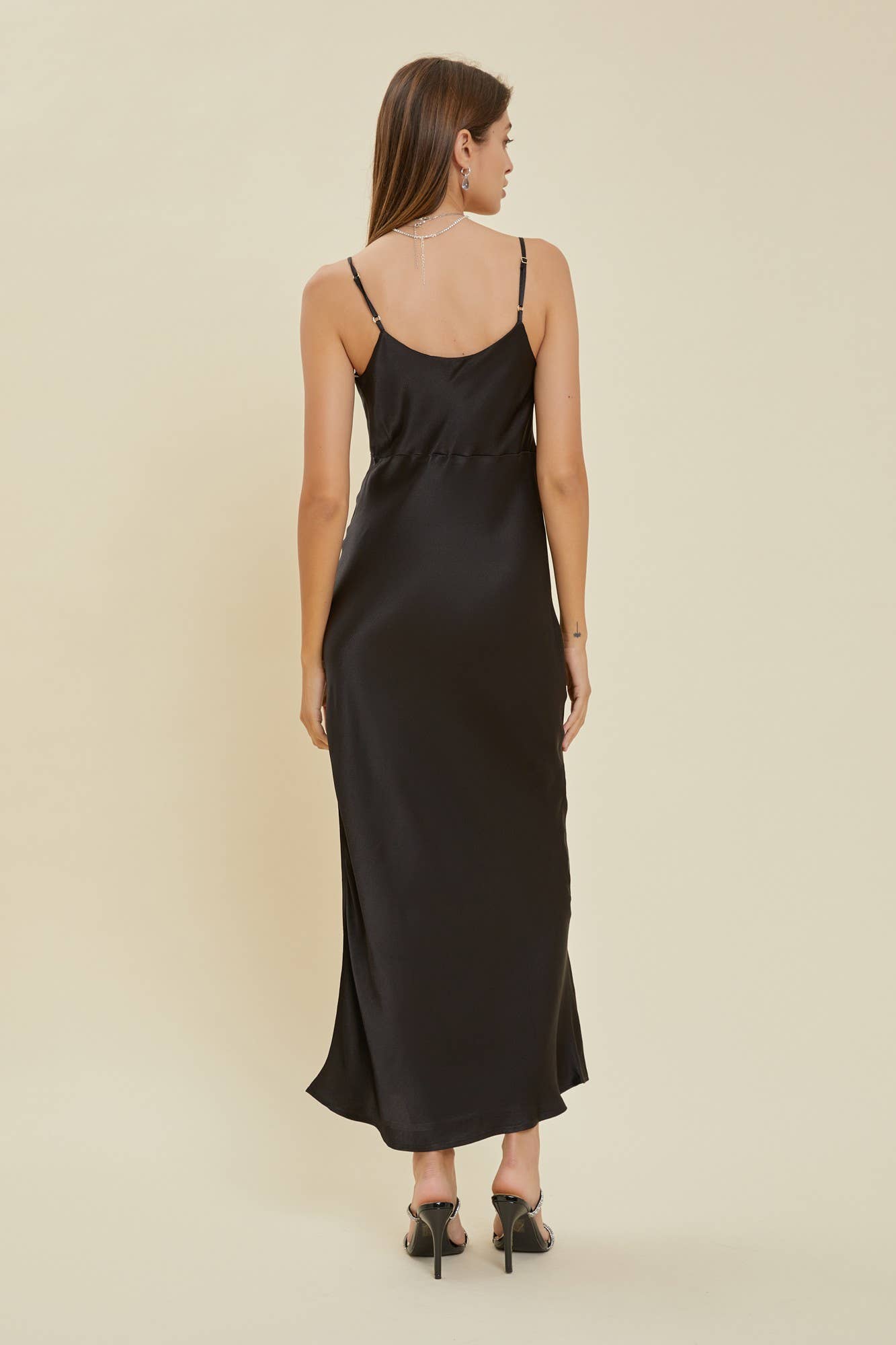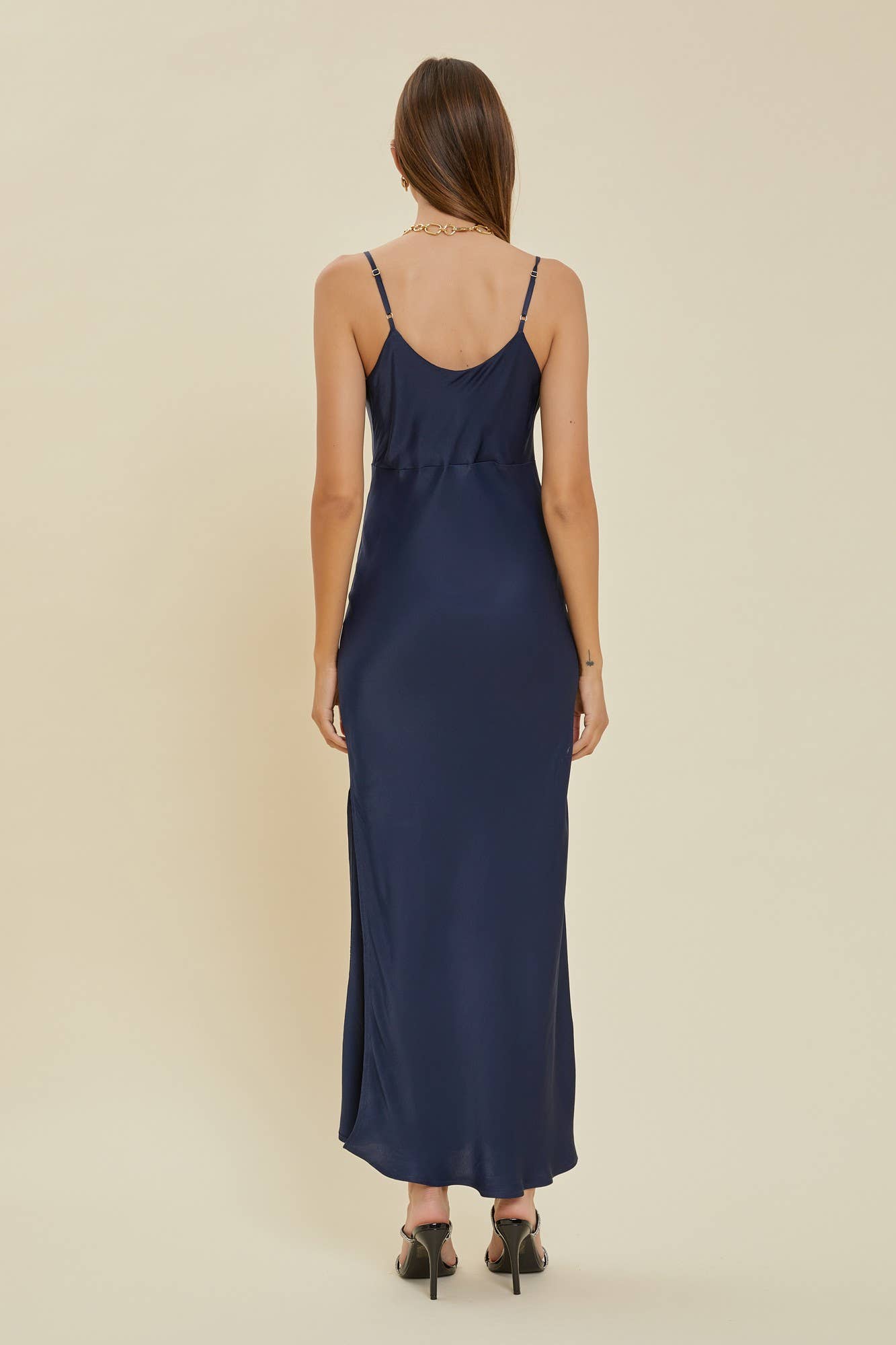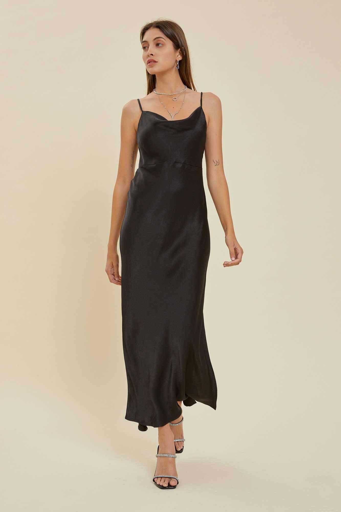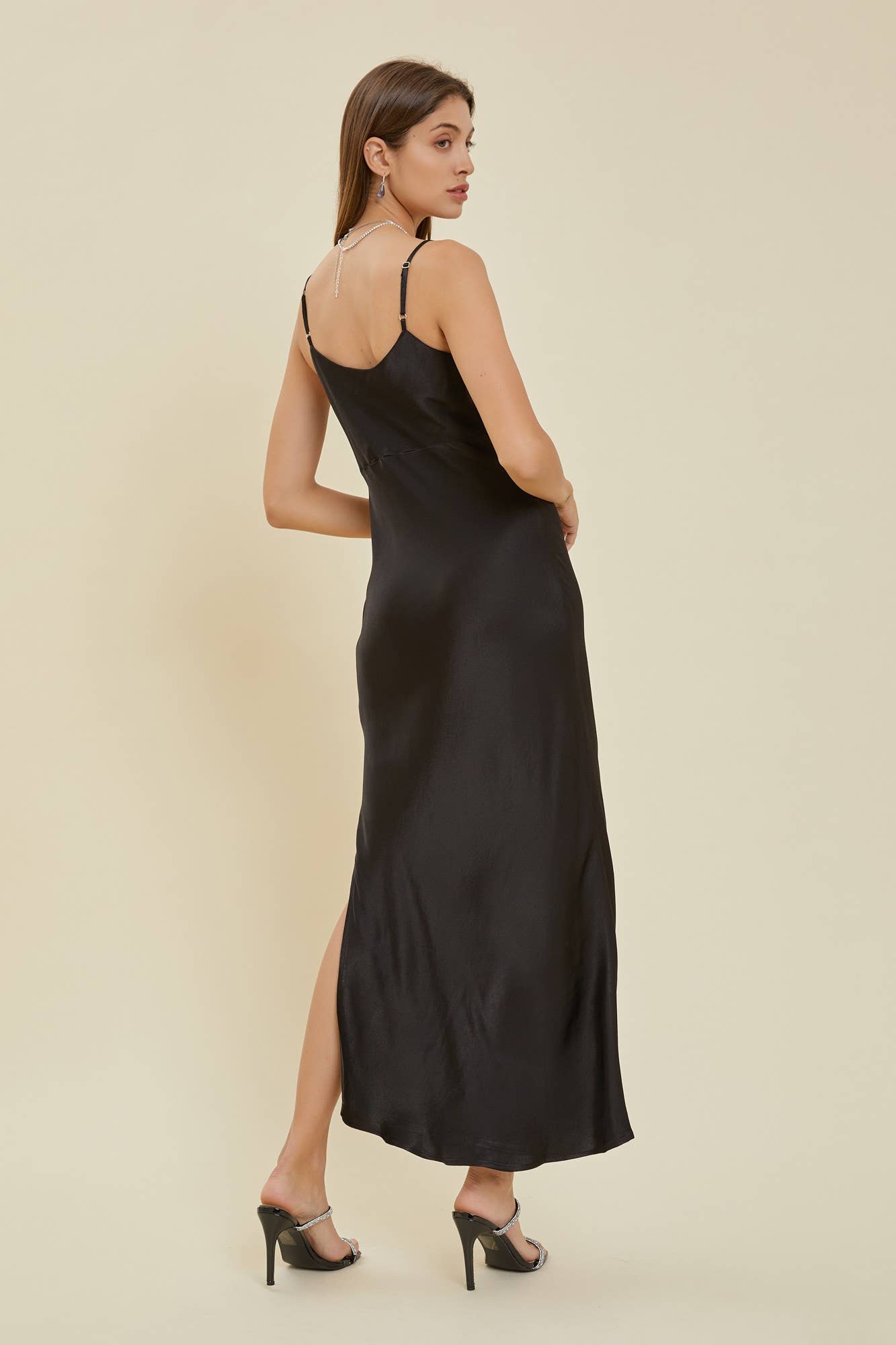 Introducing our elegant Cowl Neck Slip Dress. Made with a flattering cowl neckline and adjustable straps, it effortlessly enhances your silhouette. The side slit adds a touch of sophistication. Expertly crafted for a stunning look.