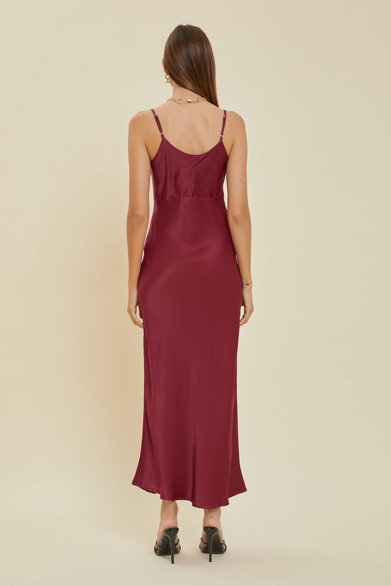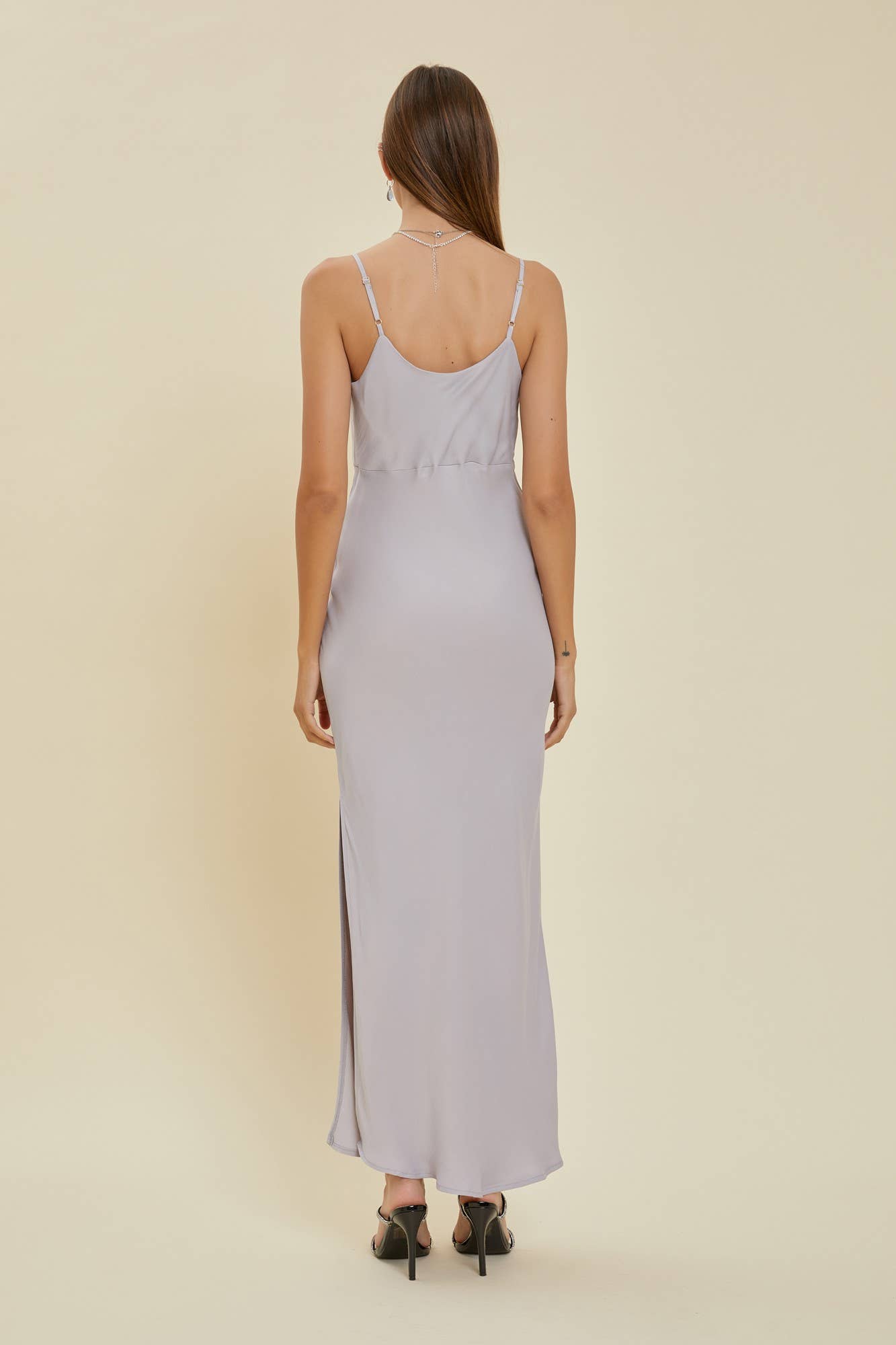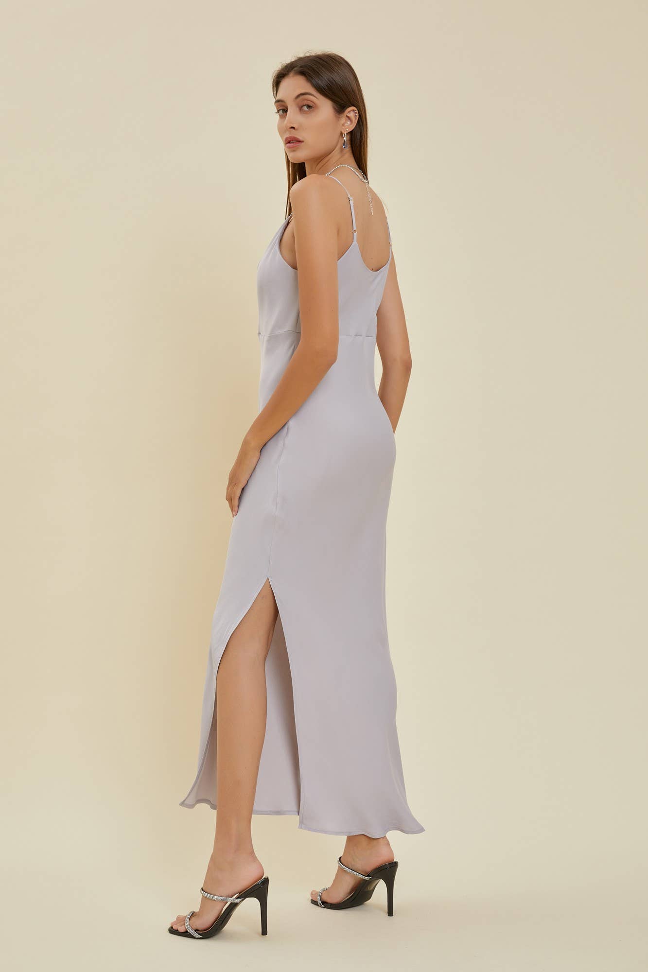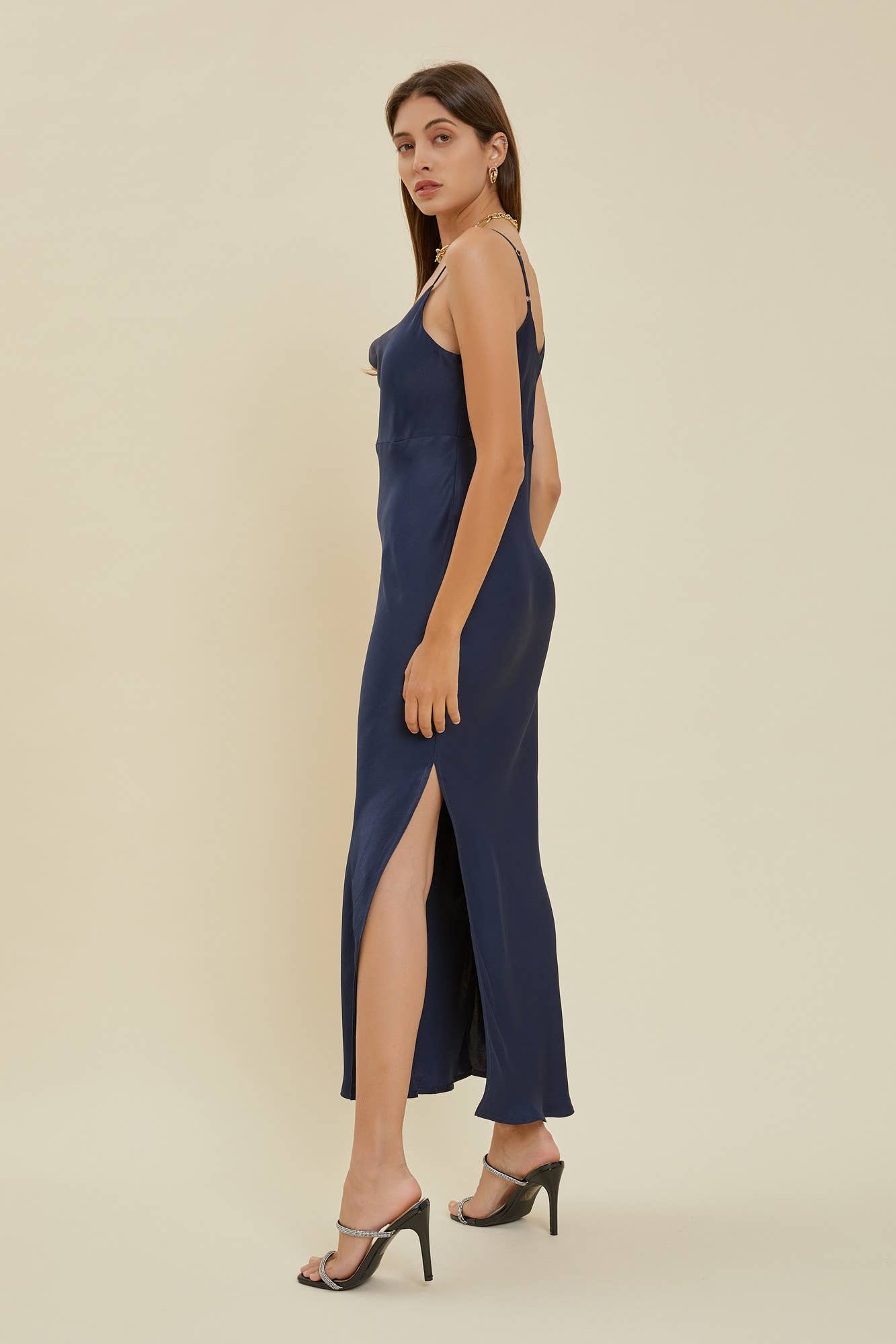Introducing our elegant Cowl Neck Slip Dress. Made with a flattering cowl neckline and adjustable straps, it effortlessly enhances your silhouette. The side slit adds a touch of sophistication. Expertly crafted for a stunning look.