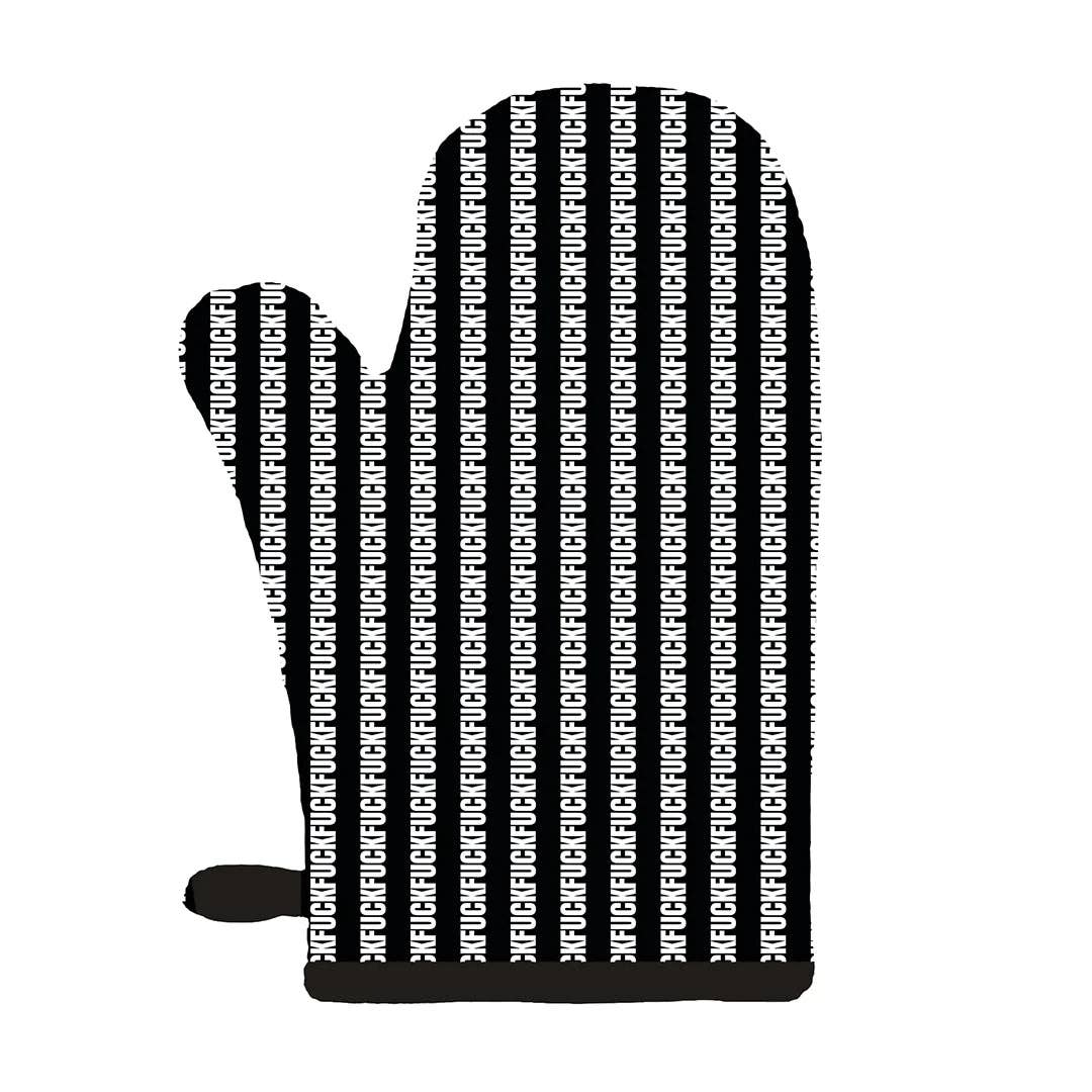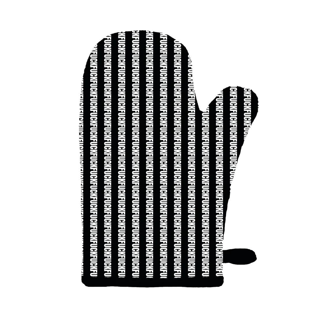 Cook your favorite meals in the kitchen with a little extra spice! Our fuck striped oven mitt features an all-cotton, comfy, natural-fitting shape. Inside they have extra-quilted insulation so hands stay cool when handling hot kitchen utensils or appliances. Screen-printed using eco-friendly inks, these oven mitts bring classic typography and the irreverent sentiment fuck to the cooking space.