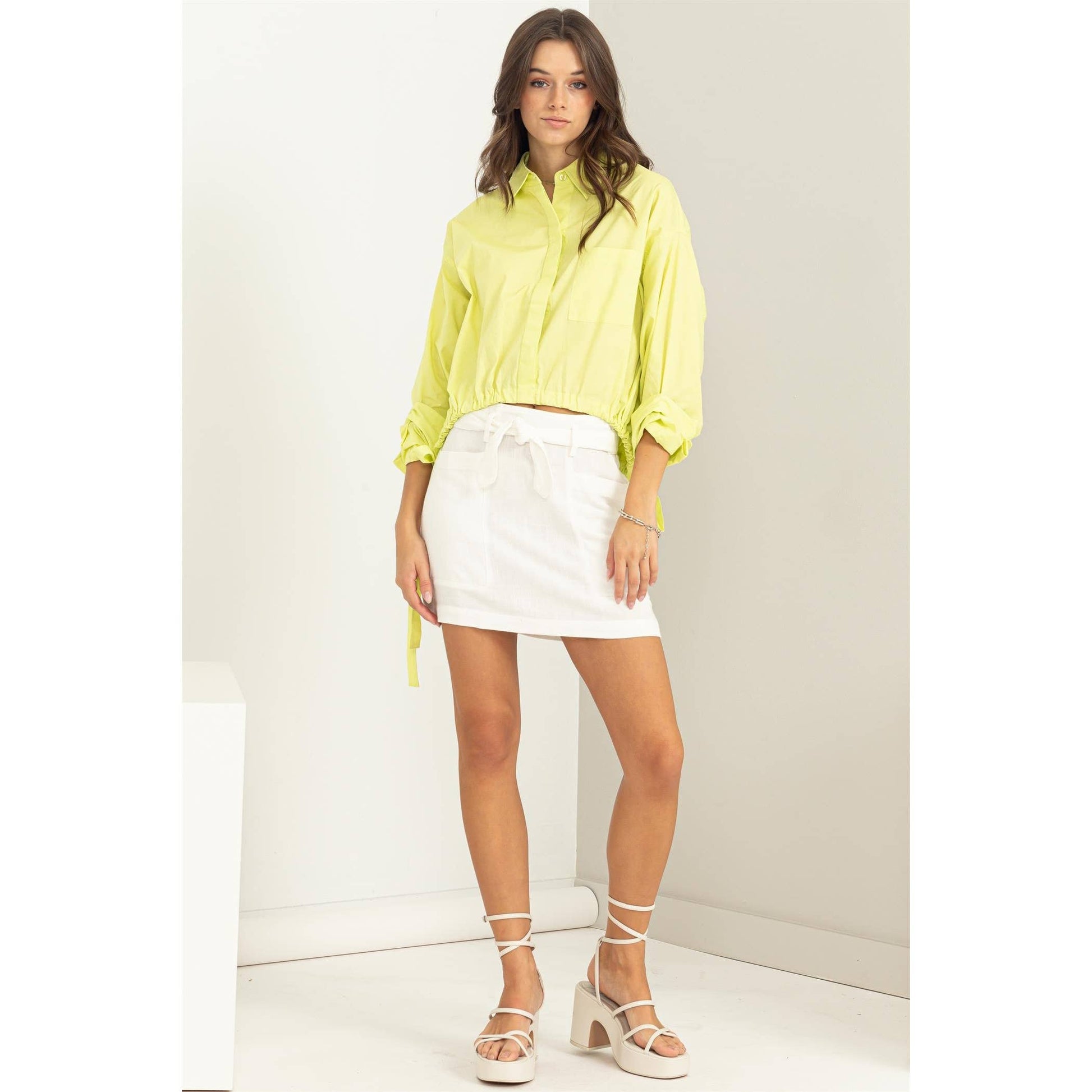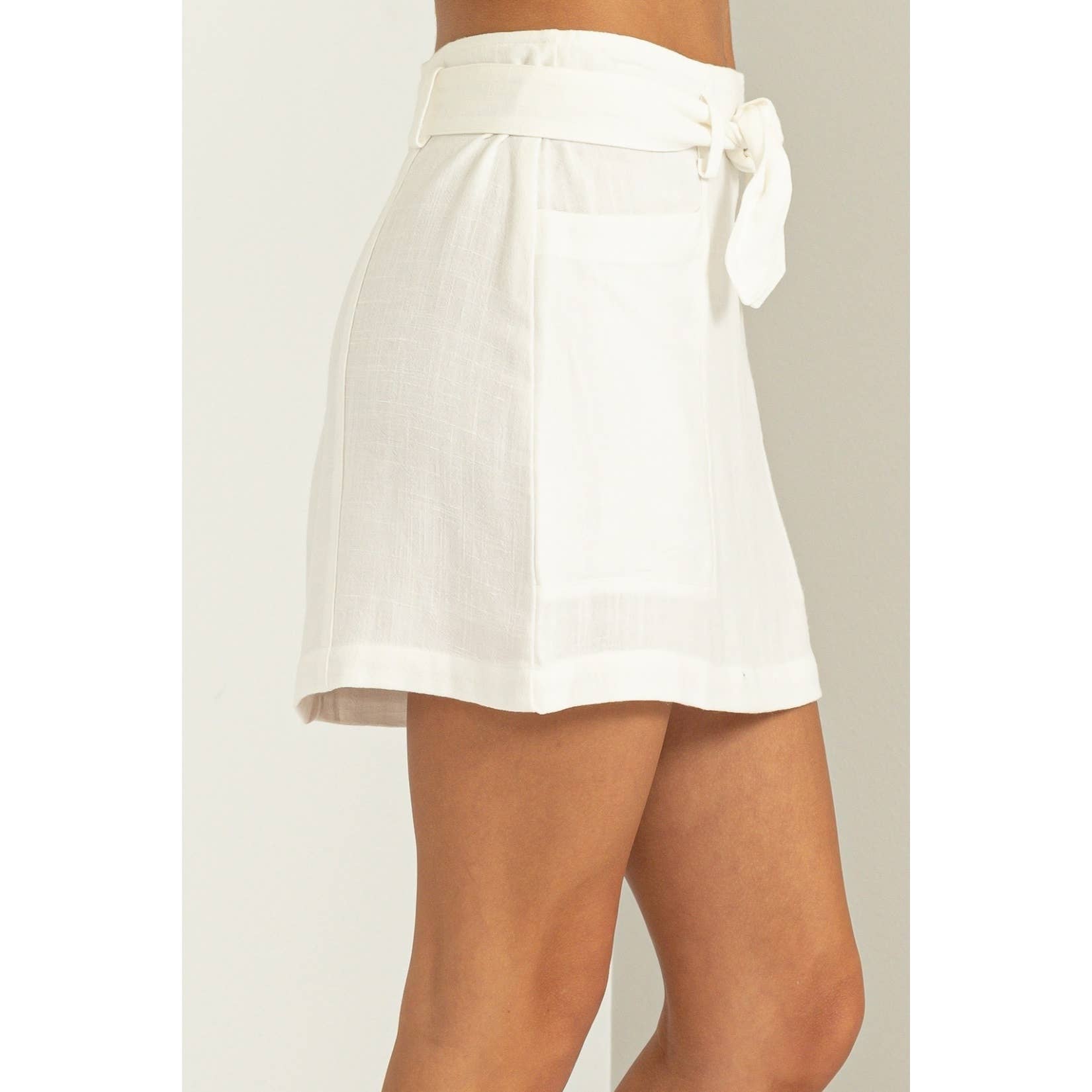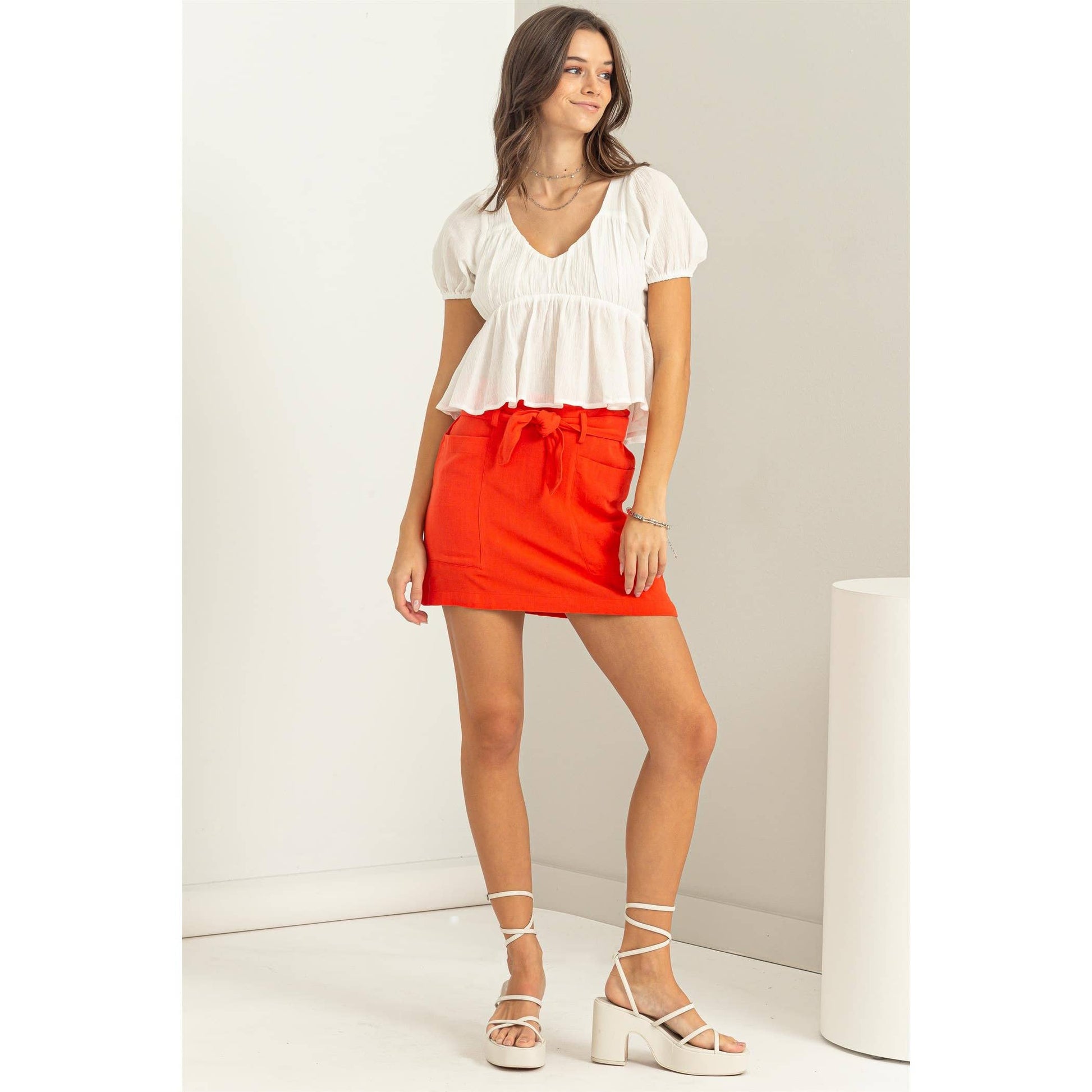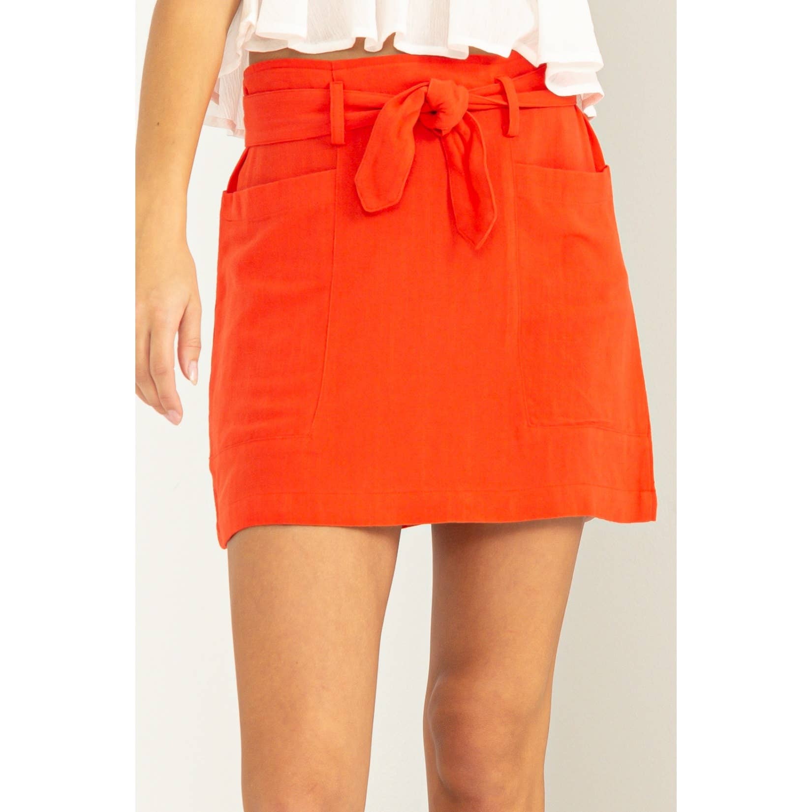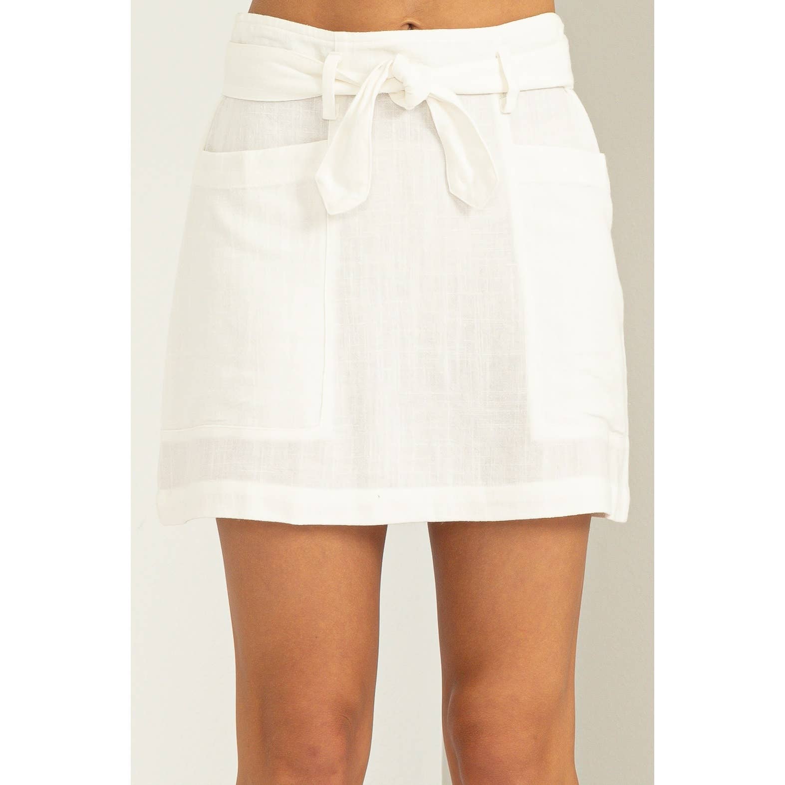 This skirt boasts a middle-rise, accentuated by a self-tie sash belt, creating an effortless and chic look. Its curve-defining silhouette is completed with twin patch pockets at the front, adding to its overall appeal.