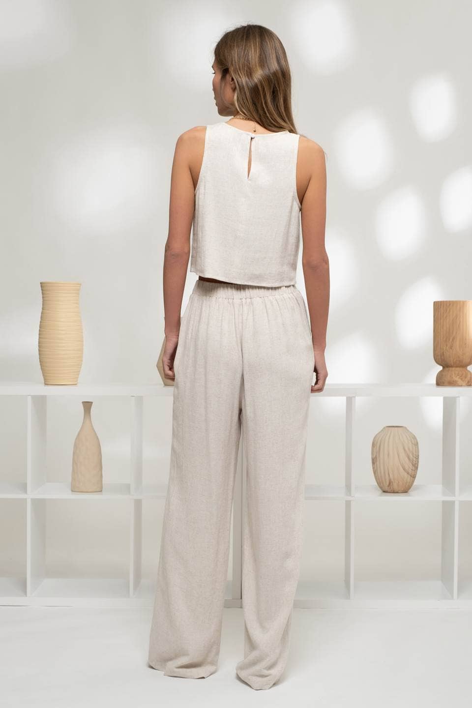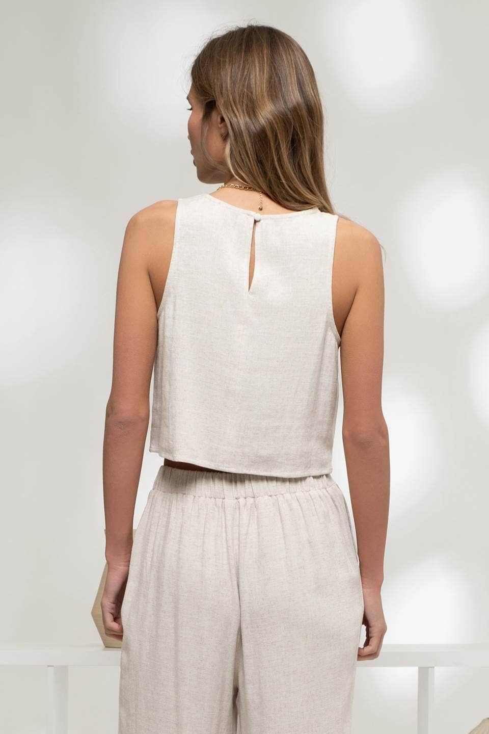 This linen sleeveless crop top is sure to elevate your summer wardrobe. Made from high-quality fabric, it offers a comfortable and breathable fit. The round neckline and back button closure add a touch of elegance to the solid blouse. Perfect for hot days and casual events.