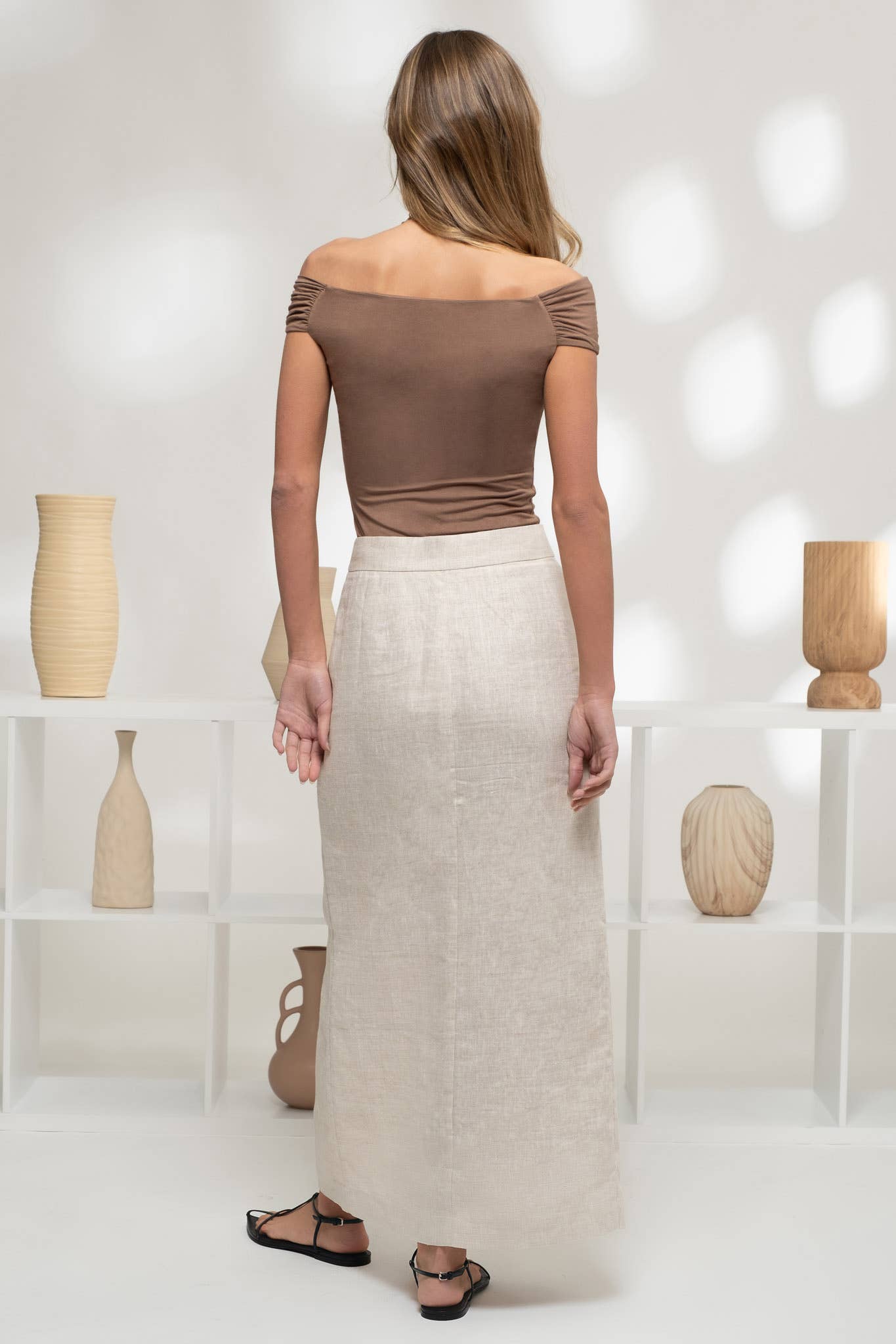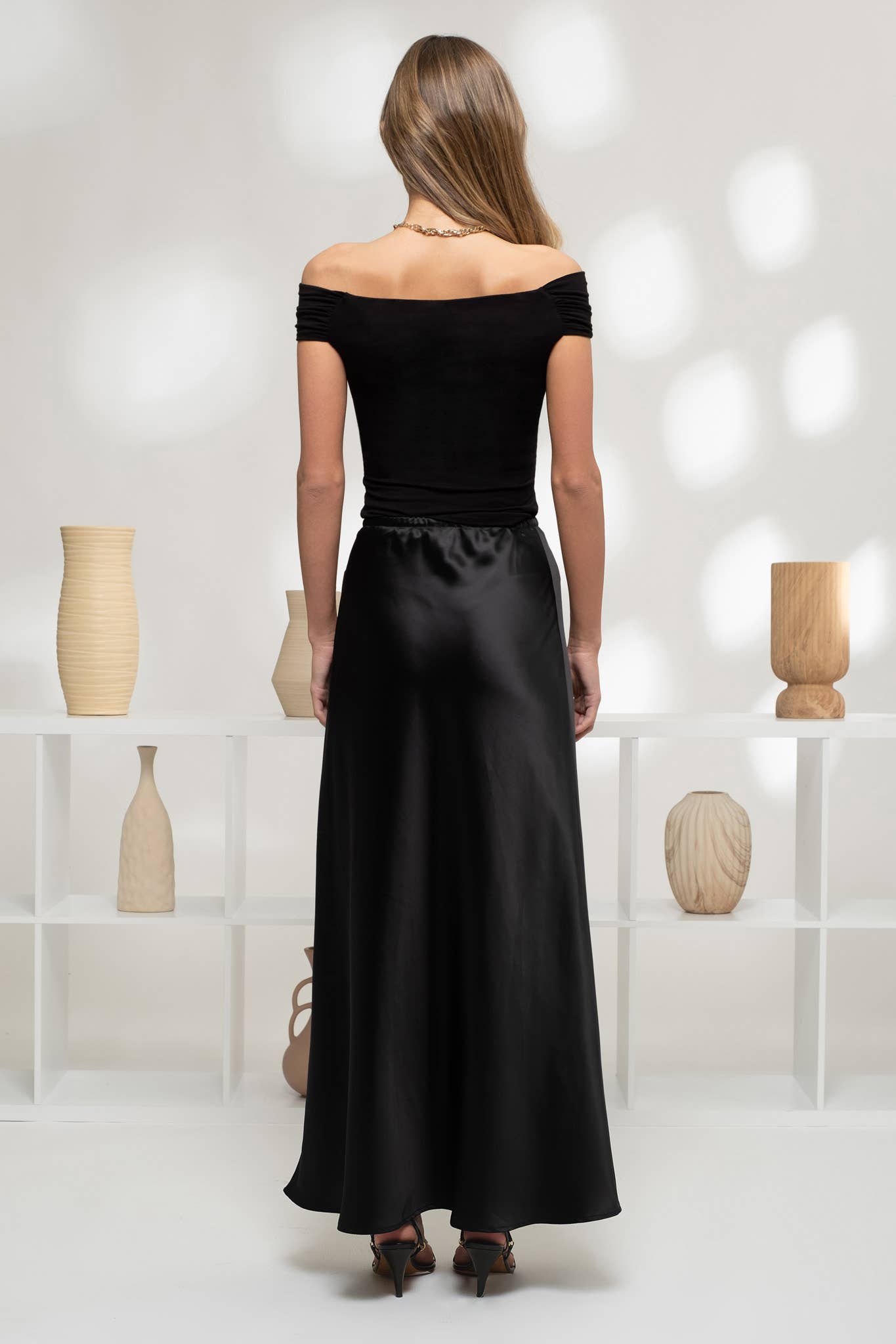 This seamless knit top features a reversible design with fitted, short rushed sleeves and an off-the-shoulder neckline, providing versatile and stylish options for any occasion.