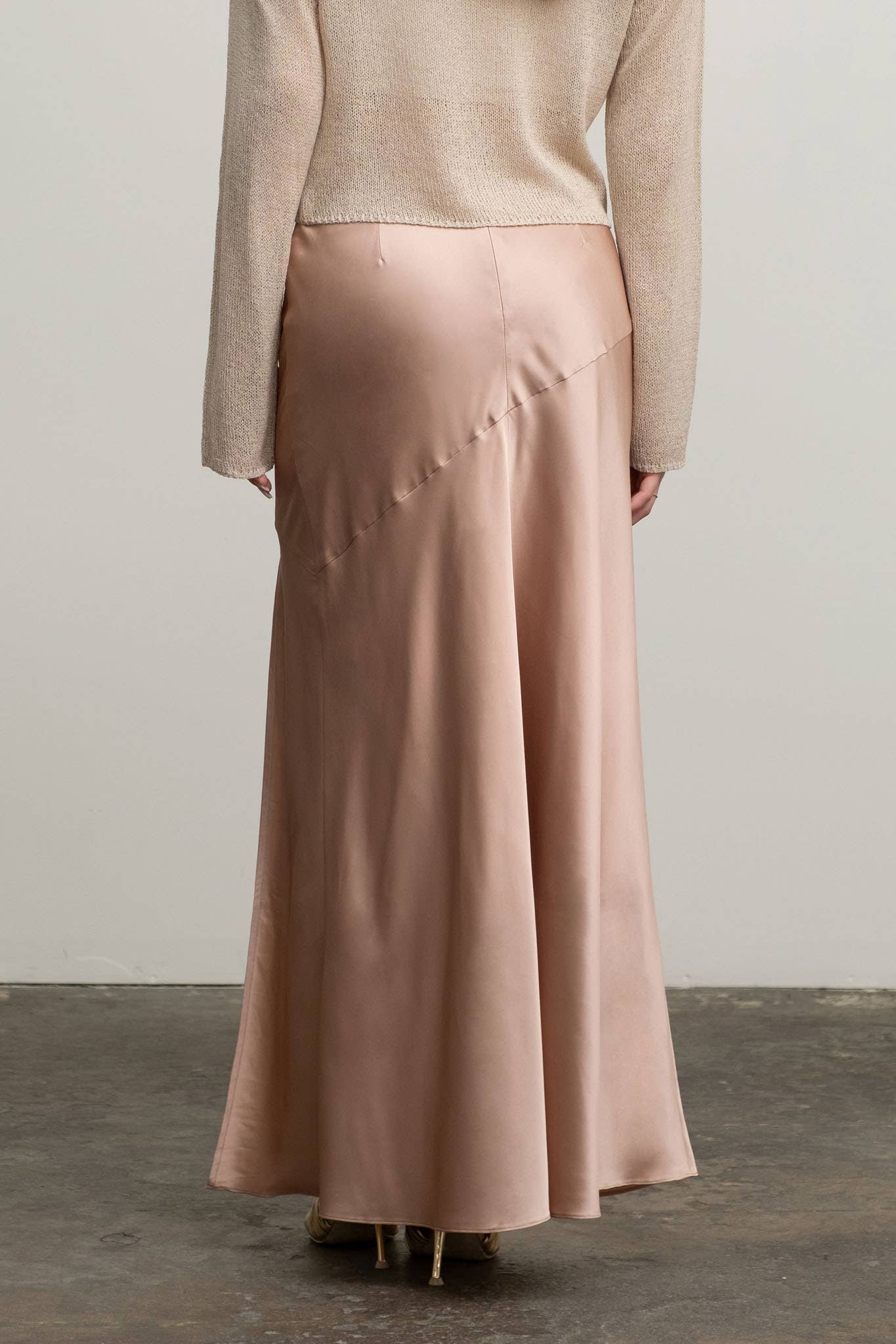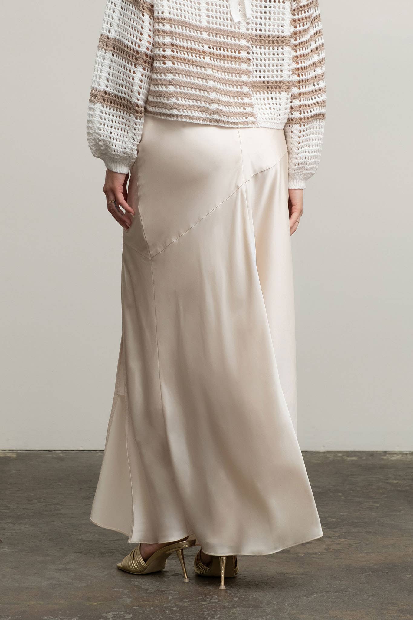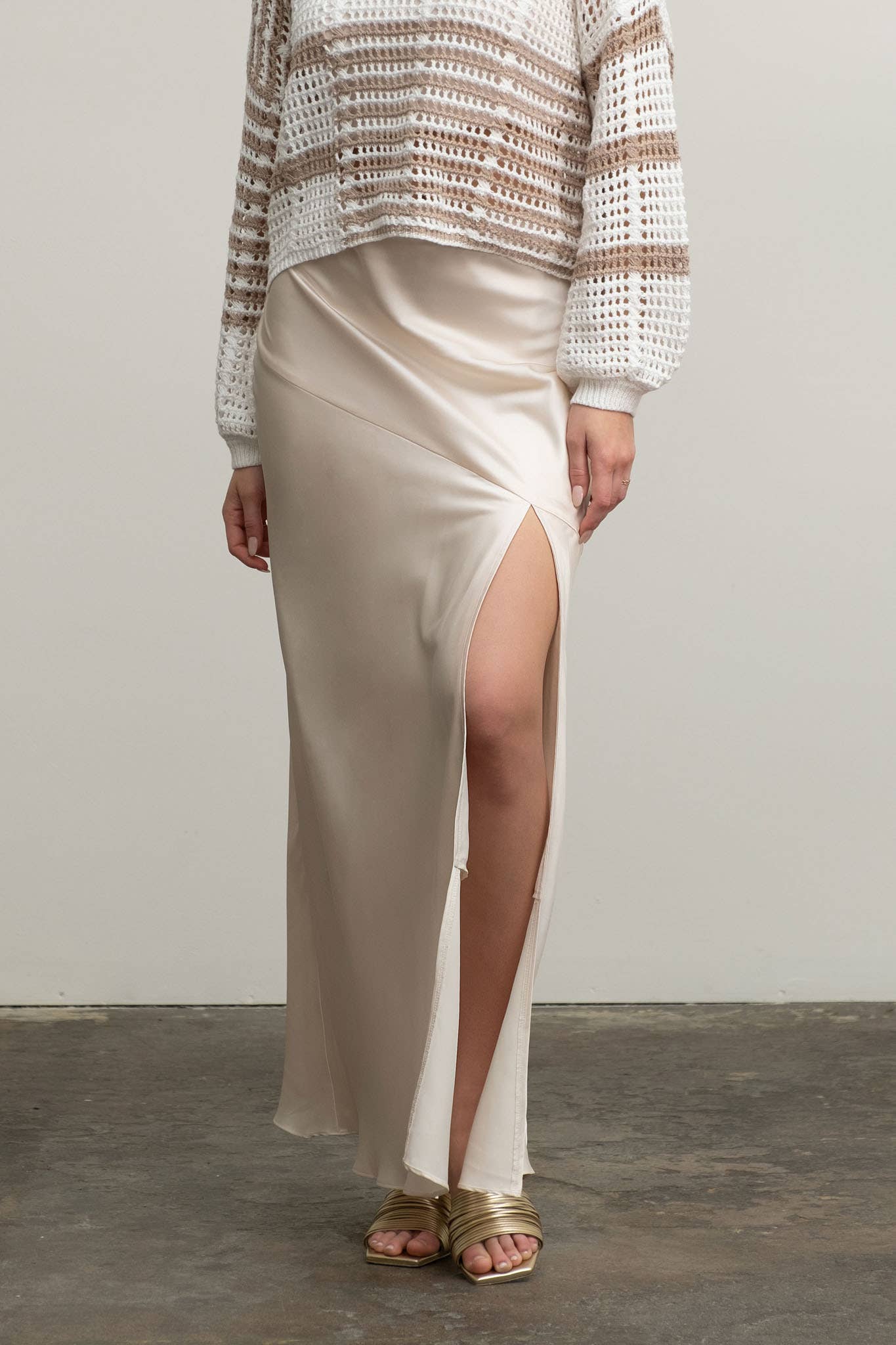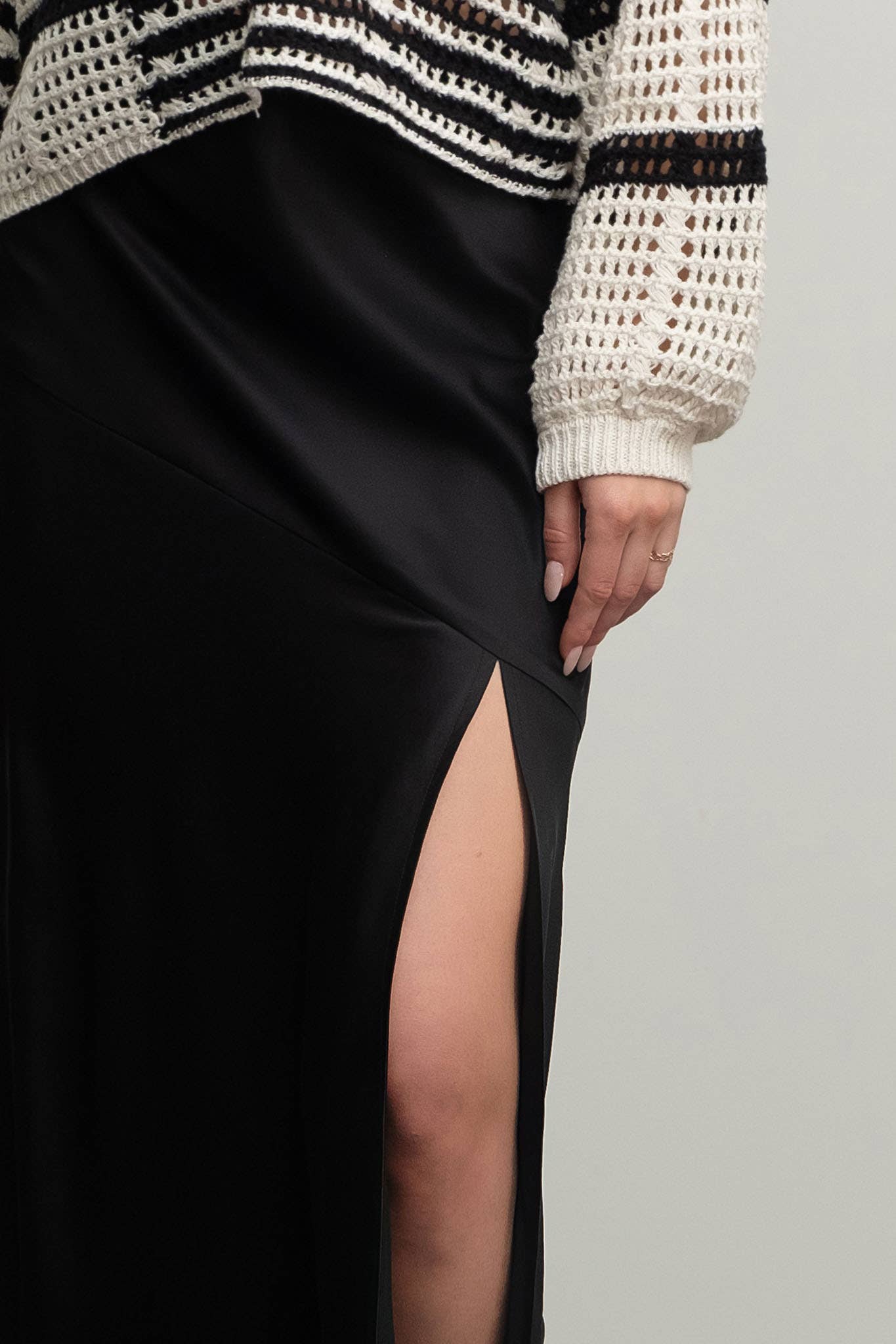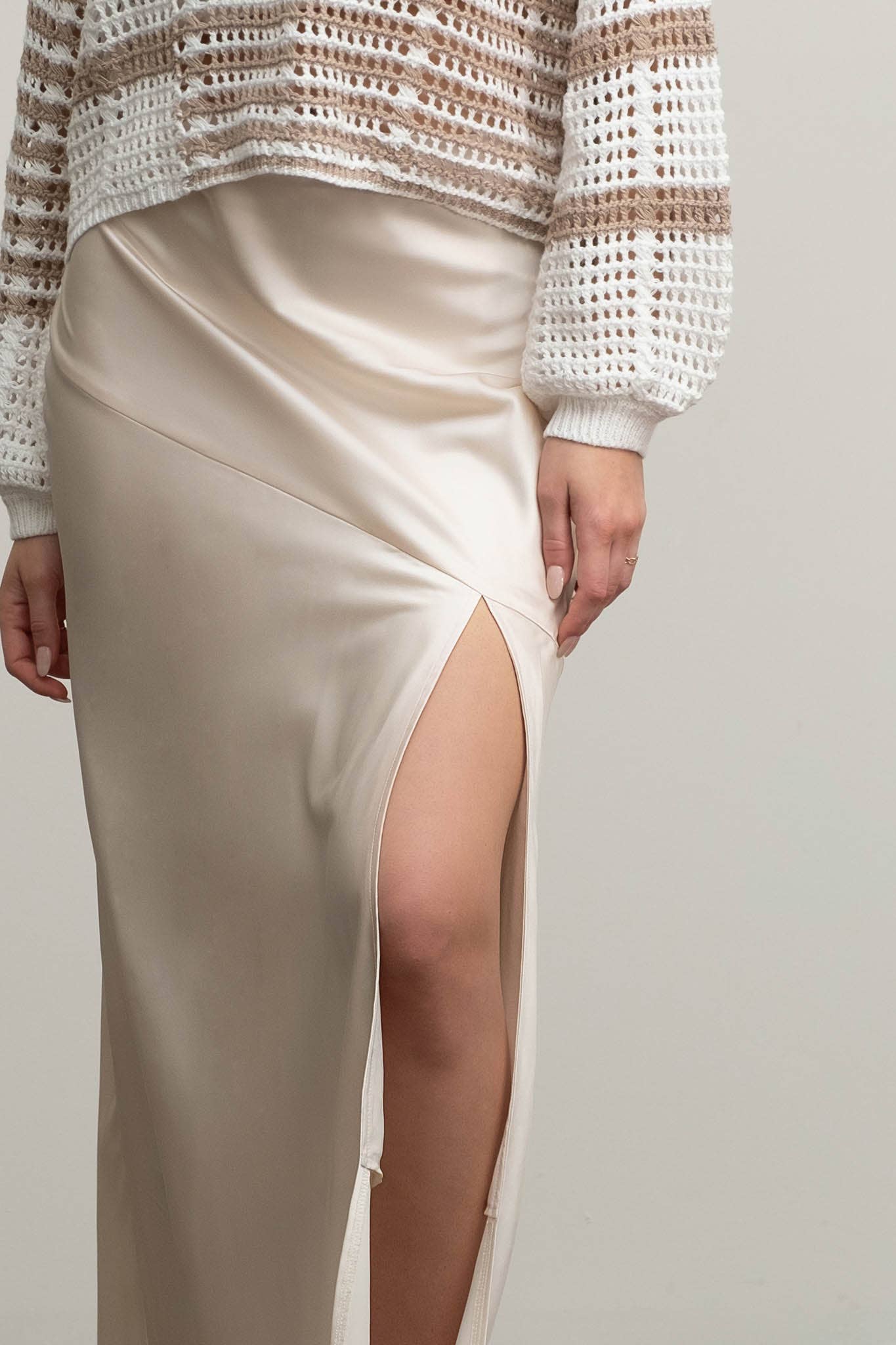 Crafted with a high waist, this midi skirt boasts a back zipper and an asymmetrical side slit, along with a satin texture for a touch of elegance. The skirt is fully lined and features a solid shell for a sleek and sophisticated look.
