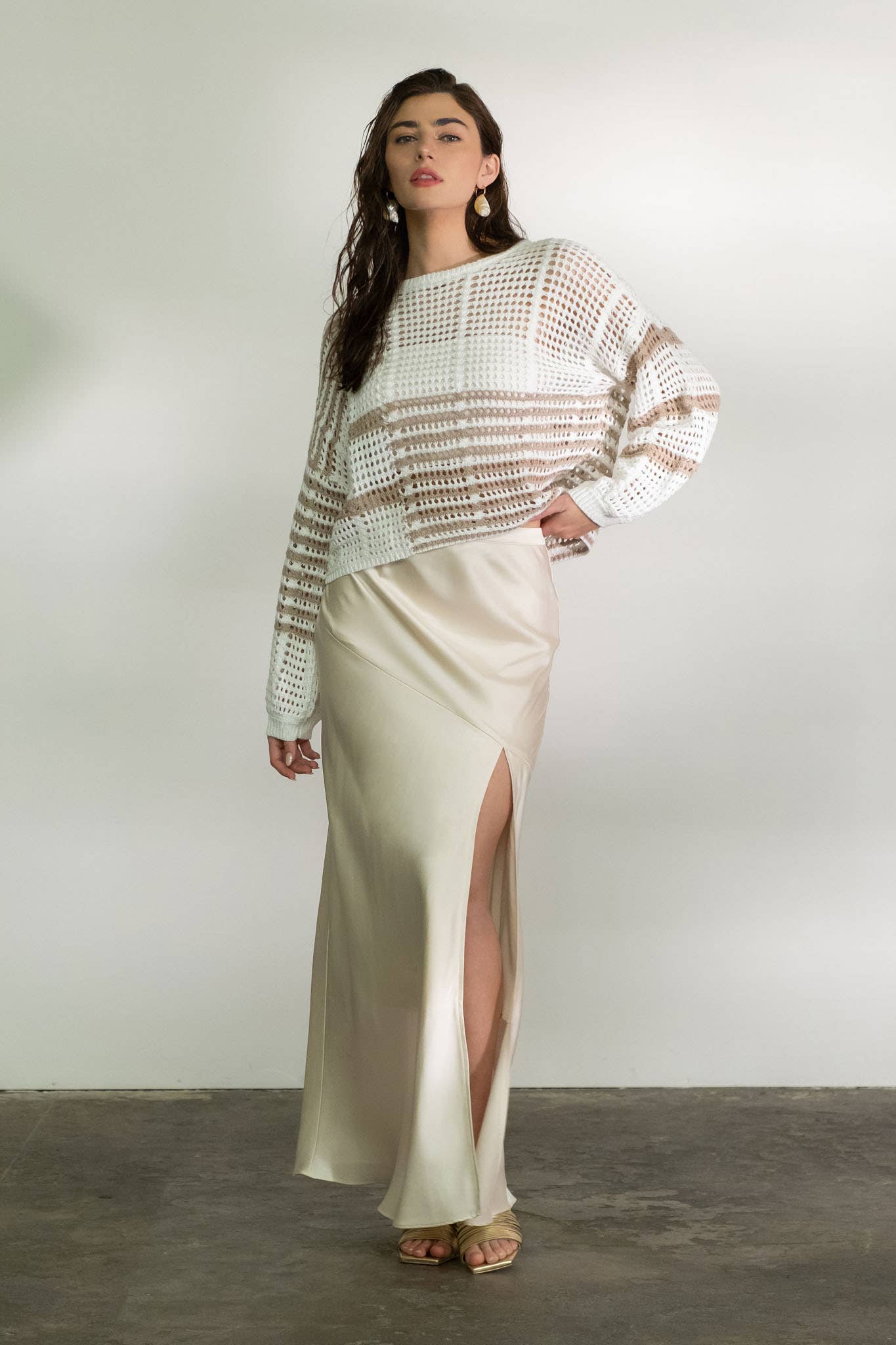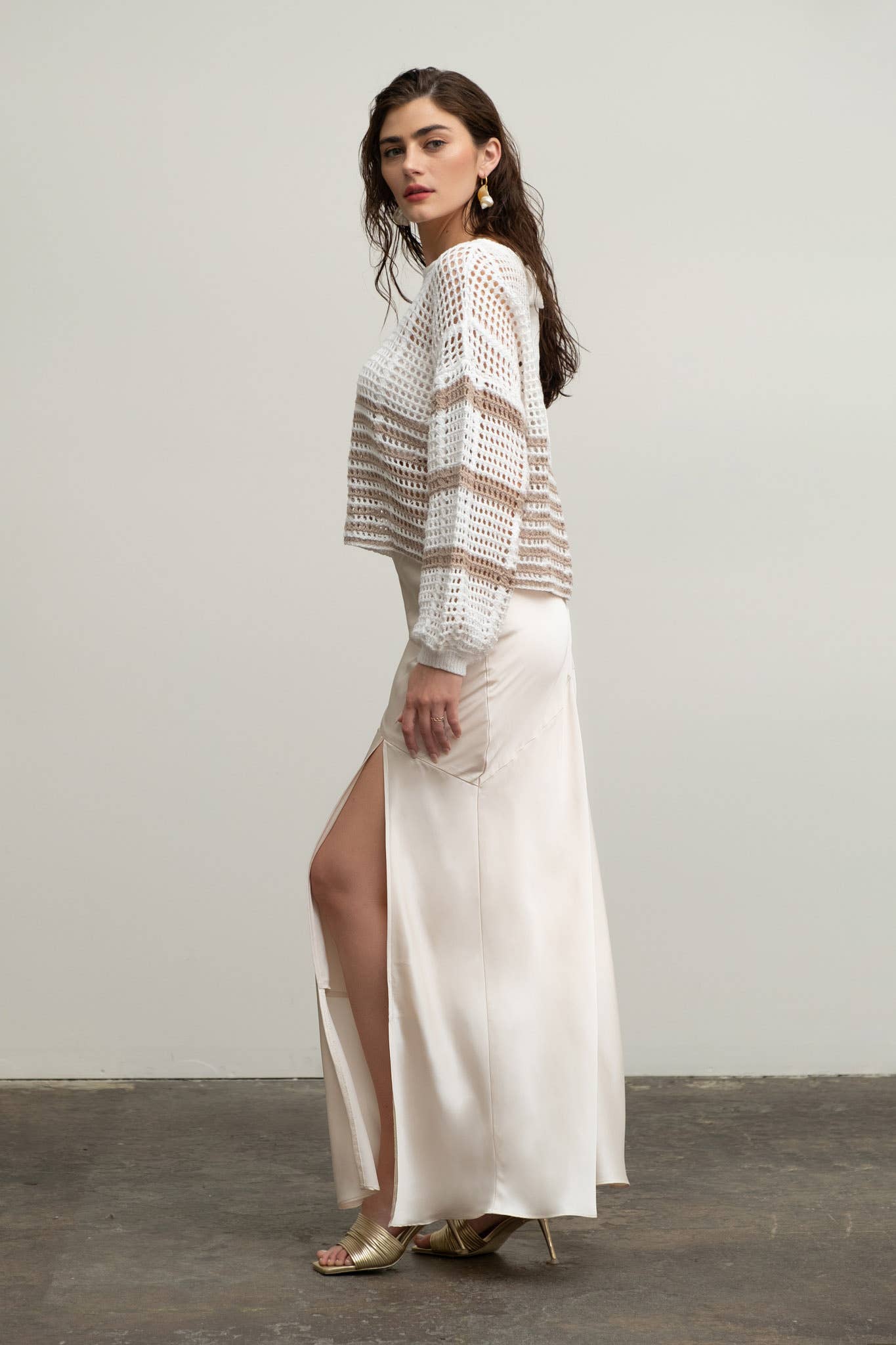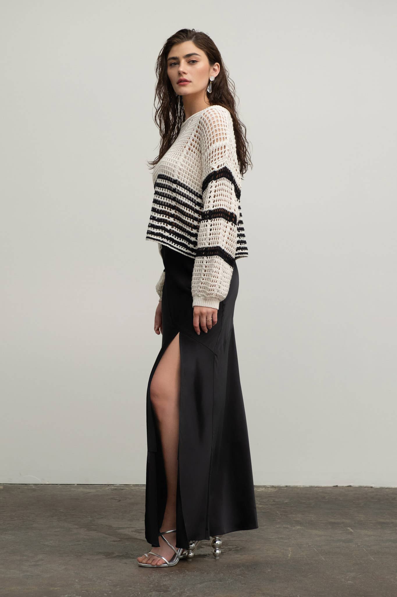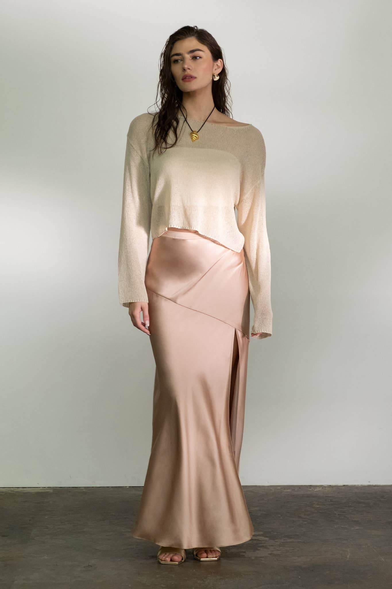 Crafted with a high waist, this midi skirt boasts a back zipper and an asymmetrical side slit, along with a satin texture for a touch of elegance. The skirt is fully lined and features a solid shell for a sleek and sophisticated look.