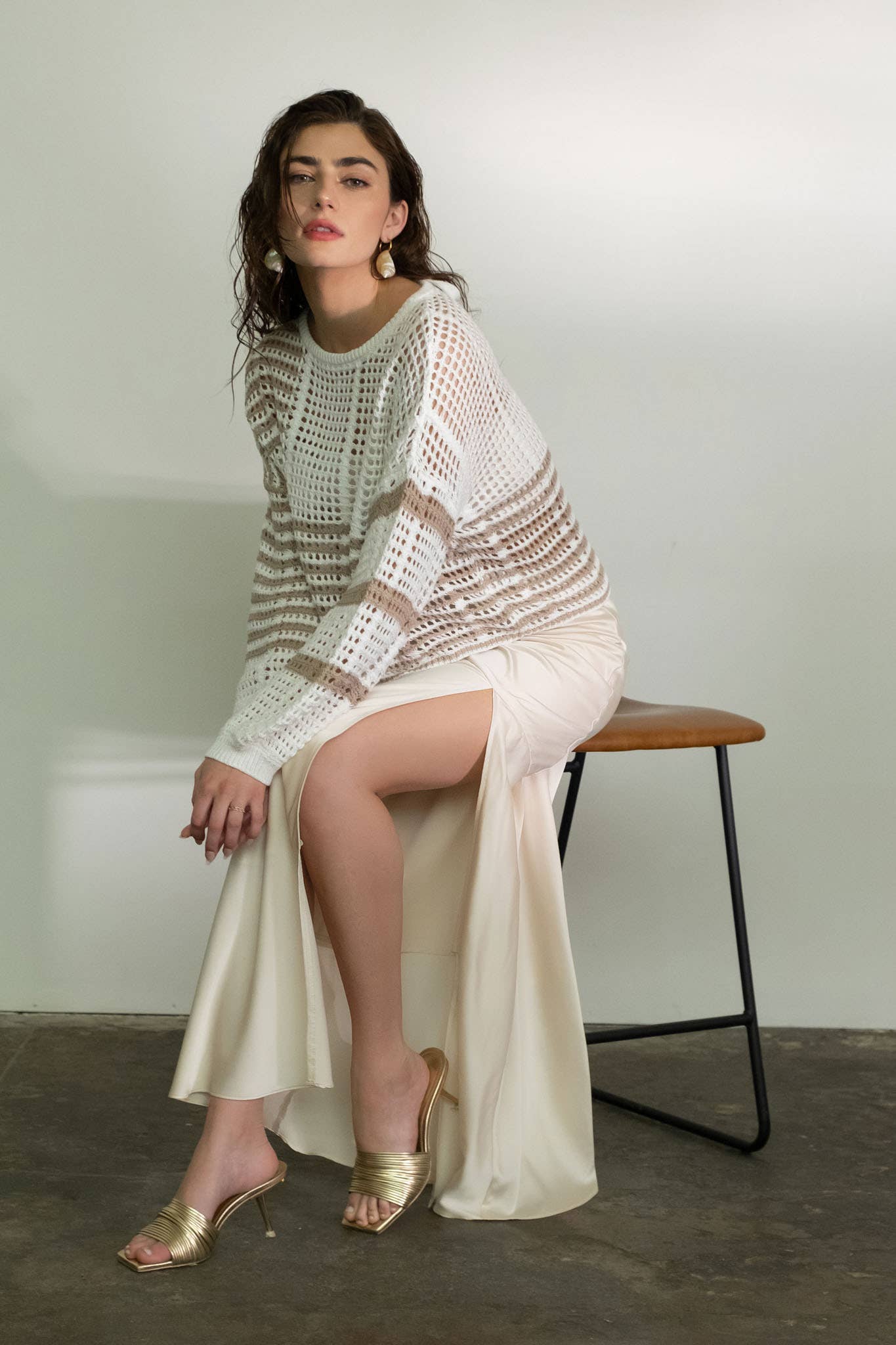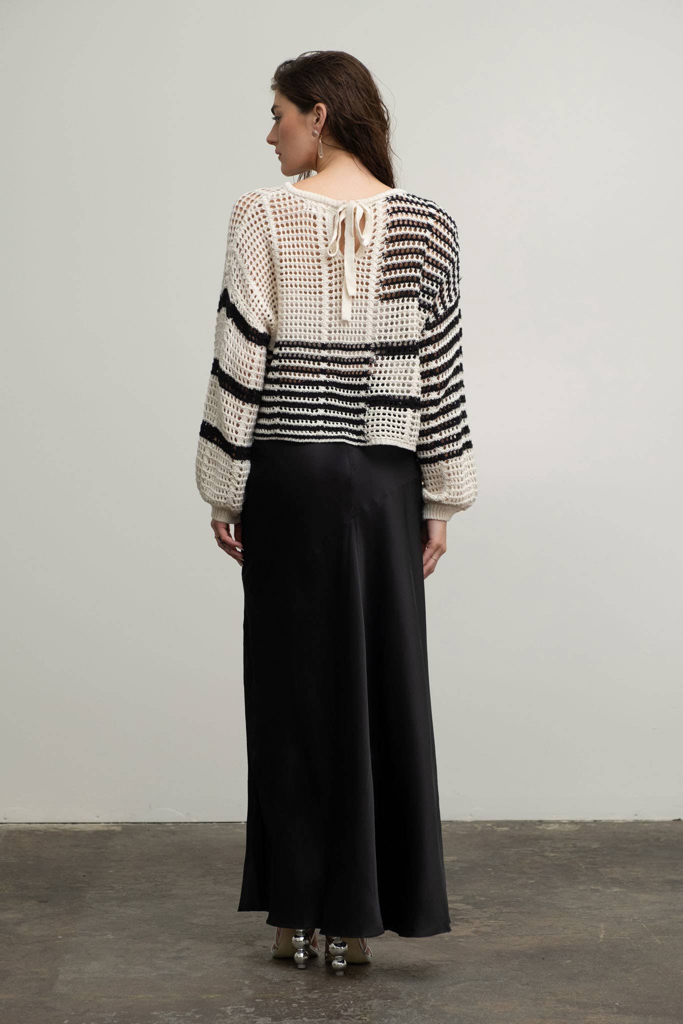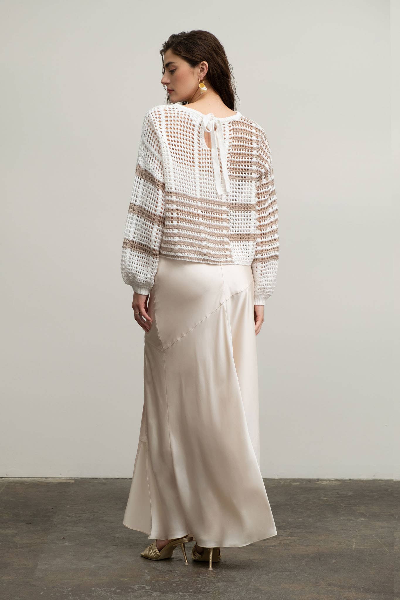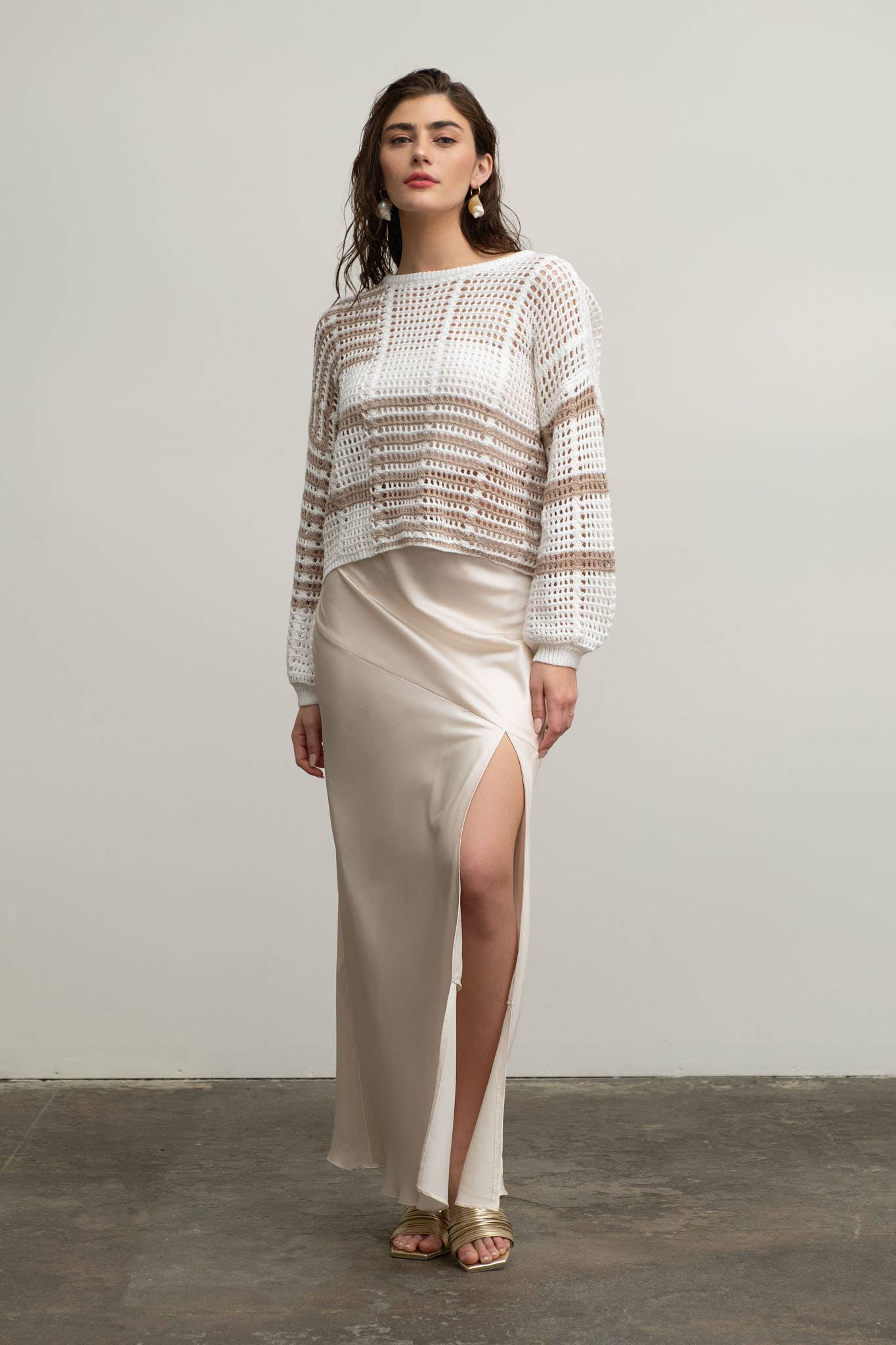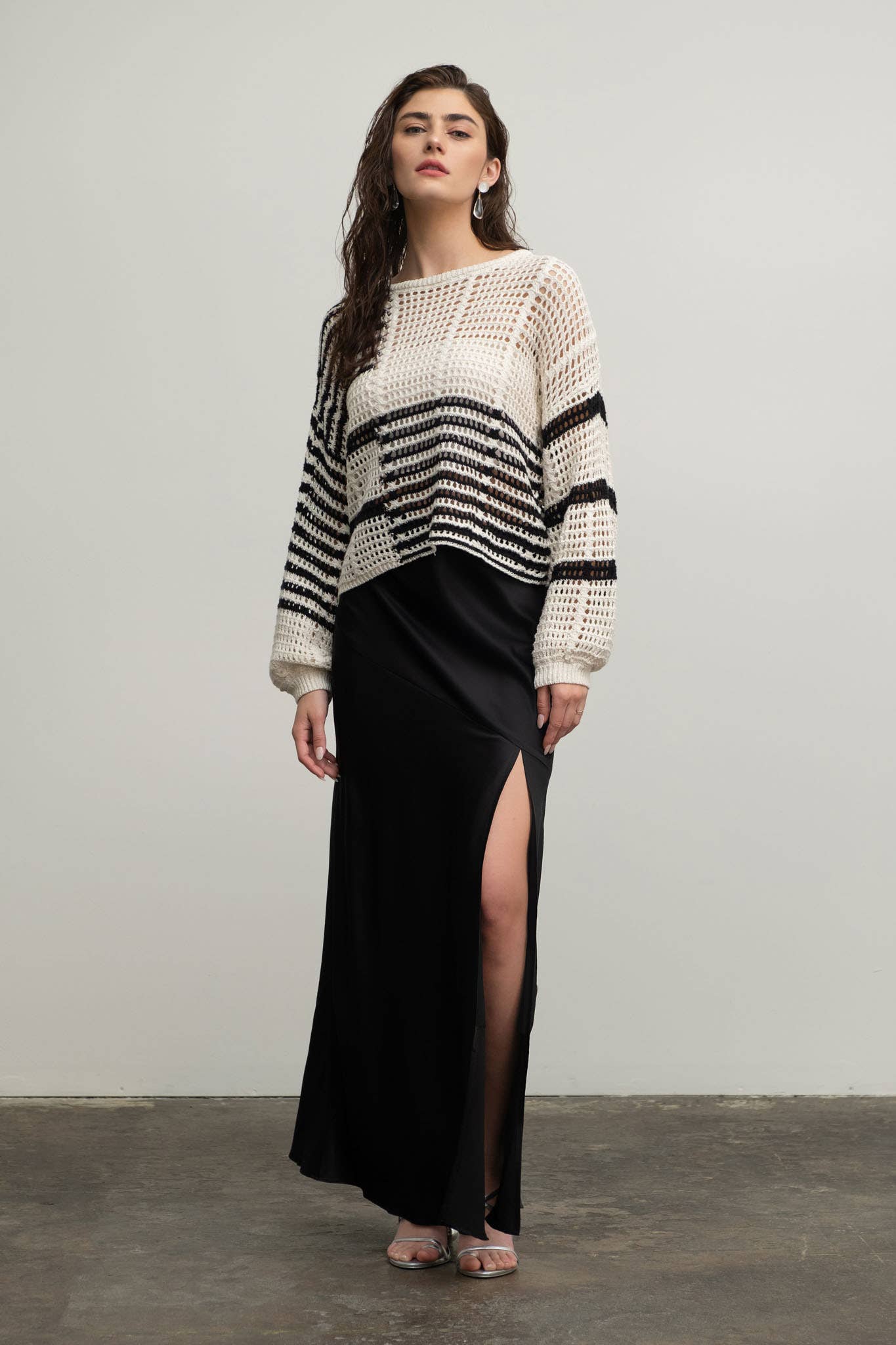 Crafted with a high waist, this midi skirt boasts a back zipper and an asymmetrical side slit, along with a satin texture for a touch of elegance. The skirt is fully lined and features a solid shell for a sleek and sophisticated look.