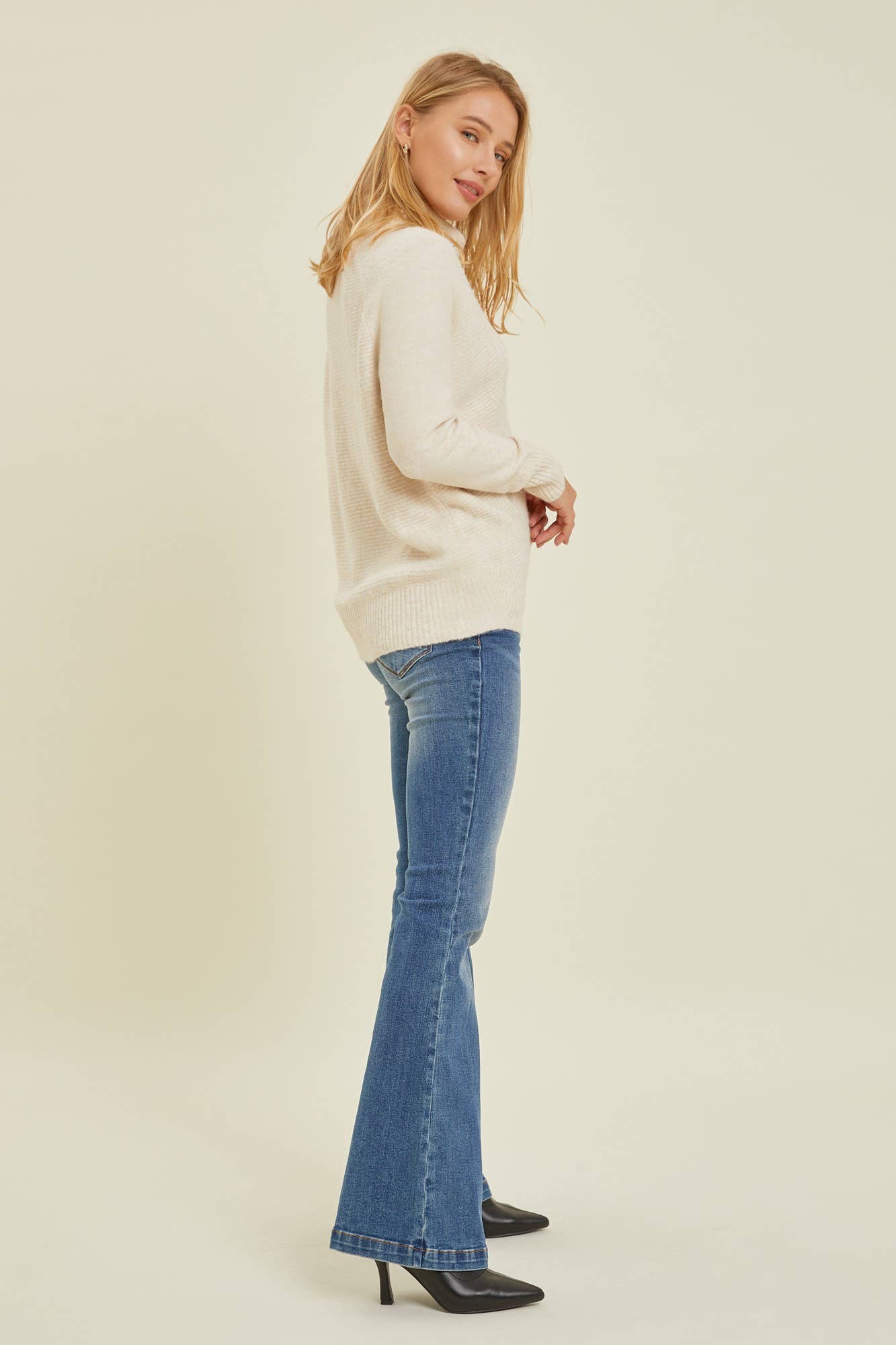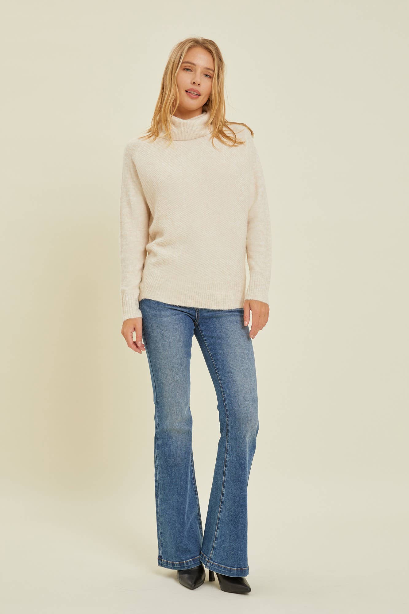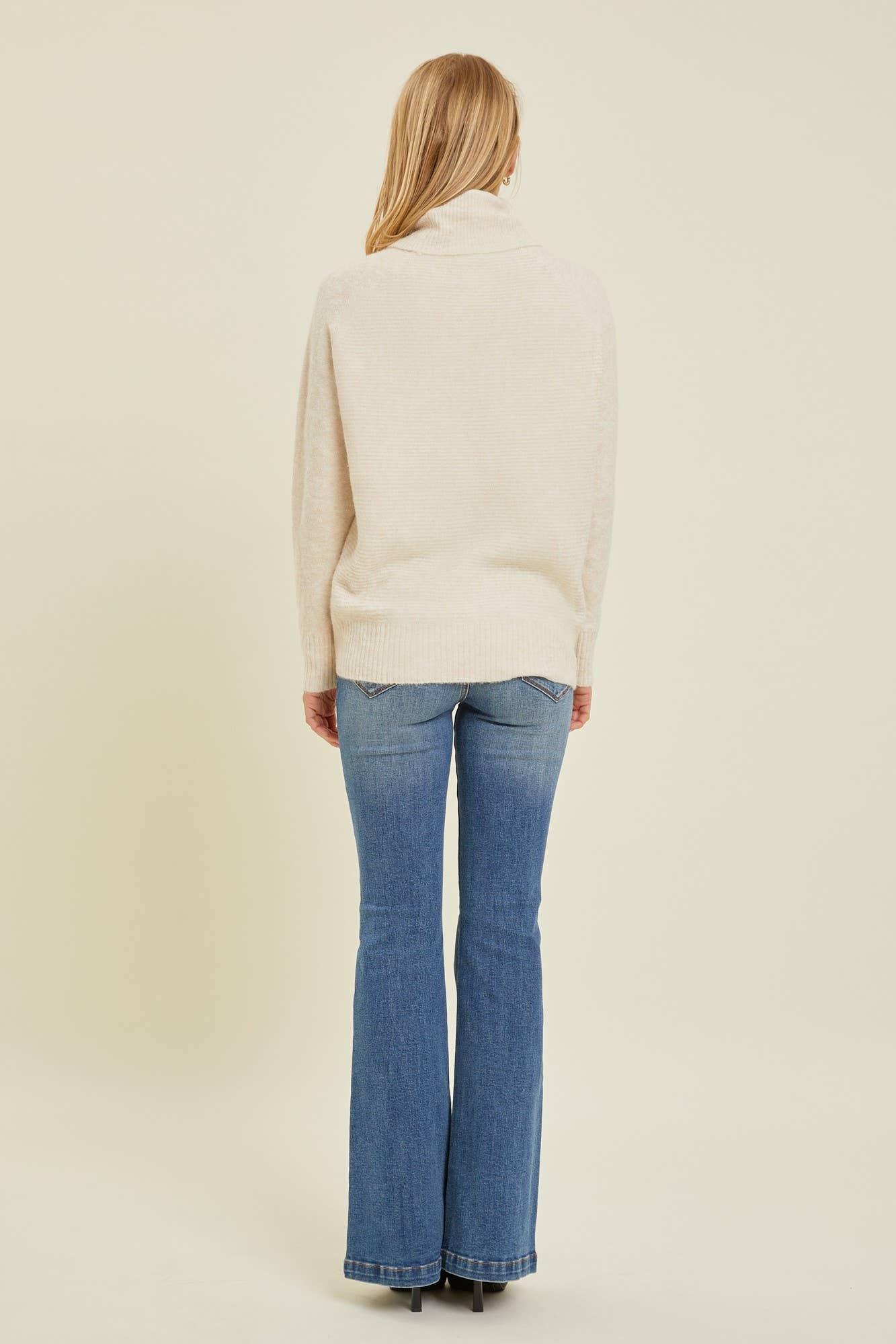 THIS SUPER SOFT SWEATER FEATURES A ROLLED TURTLENECK, RIBBING AT THE CUFFS, & HORIZONTAL RIBBING DETAIL THROUGH THE BODY