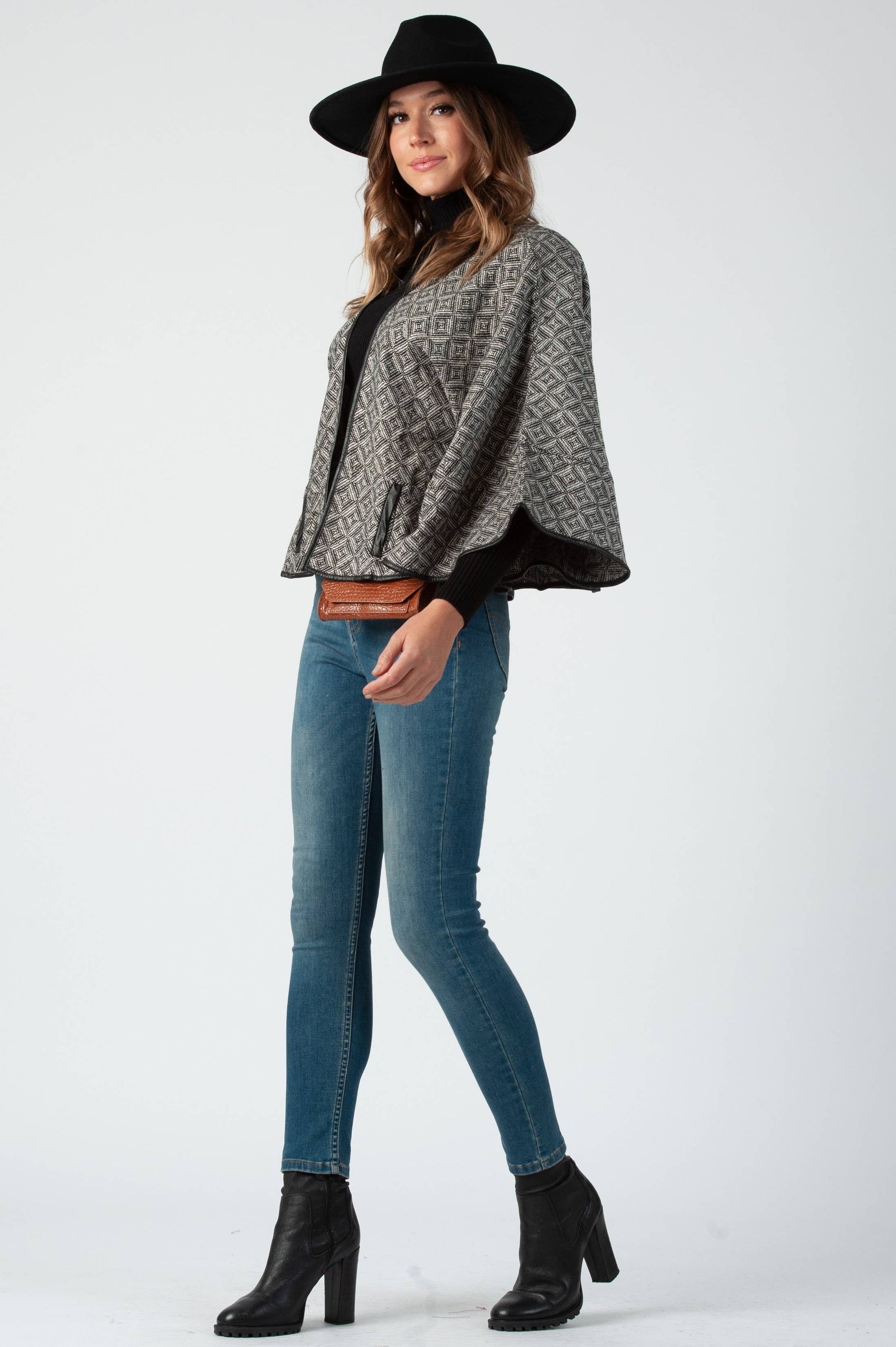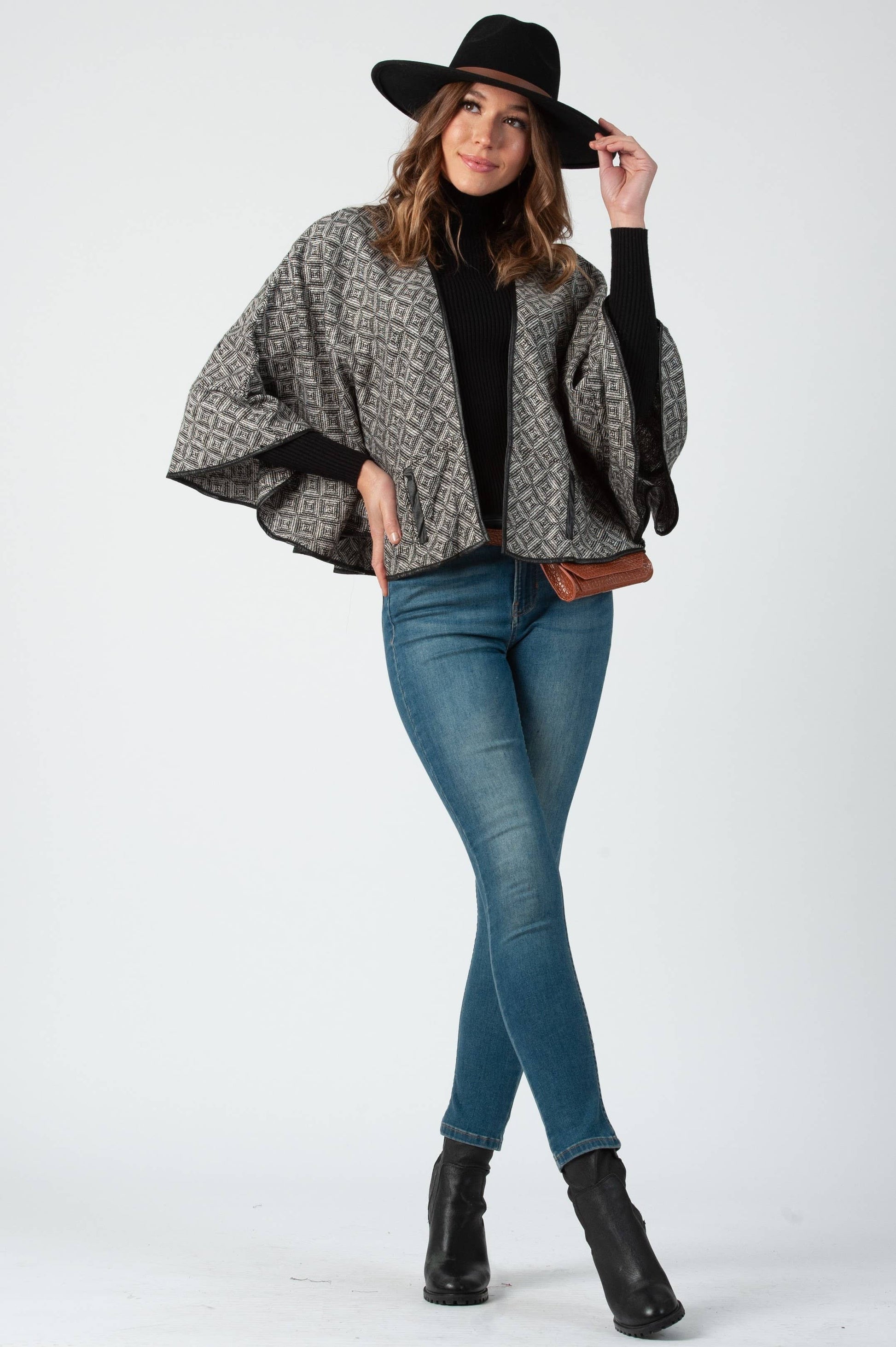 This Tweed Herringbone Cape Jacket comes with convenient pockets and features elegant Faux Leather details.